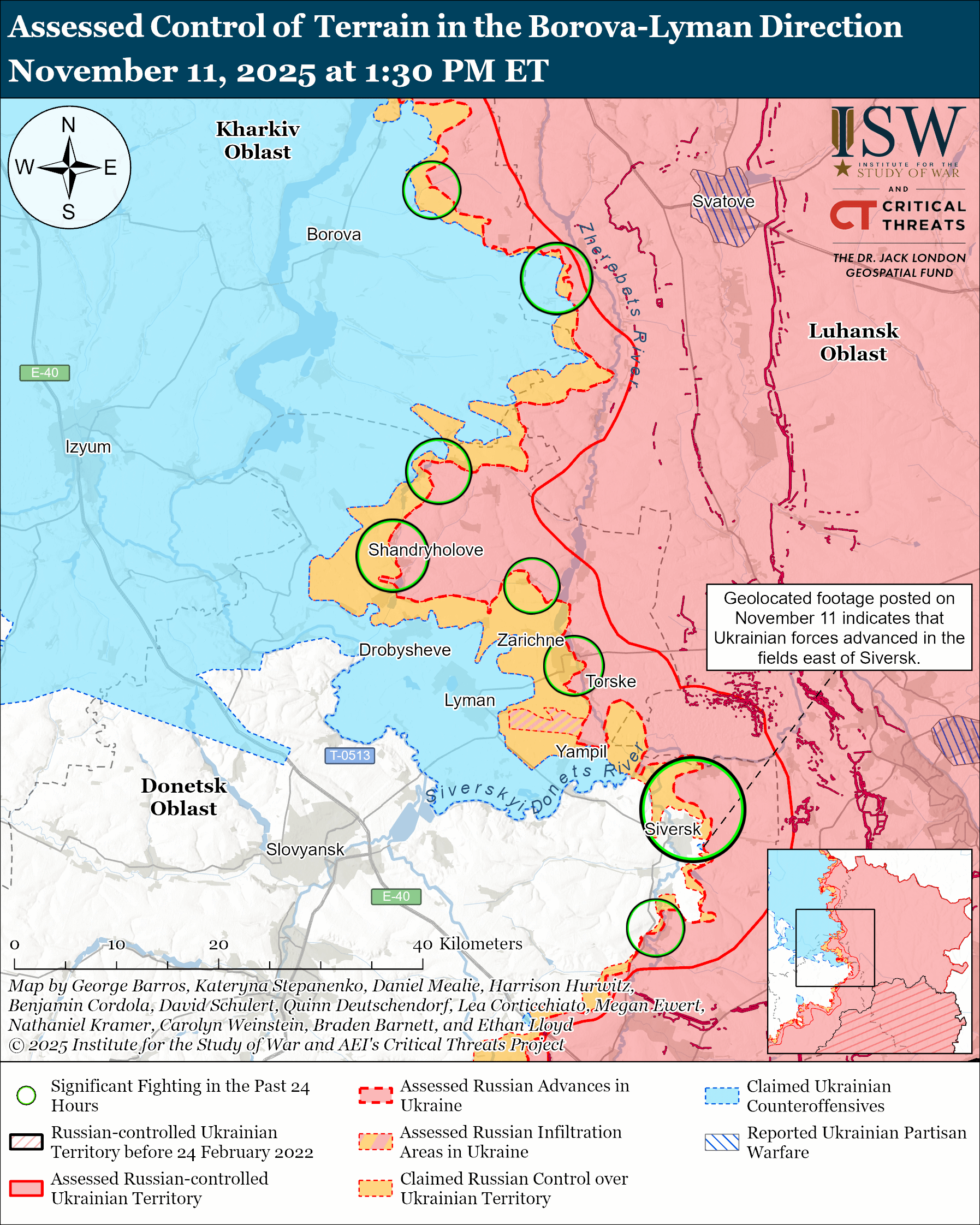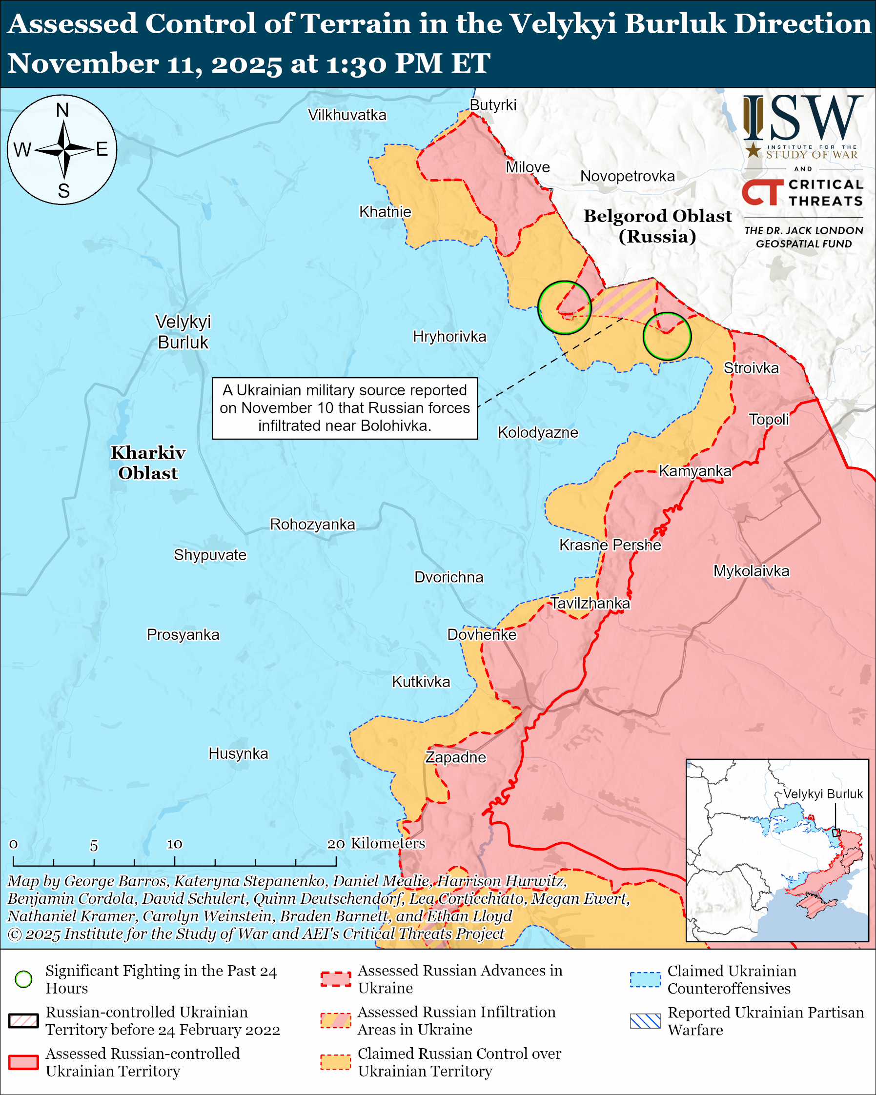 Both Ukrainian and Russian forces recently advanced in the Pokrovsk direction. Ukrainian military observer Kostyantyn Mashovets reported on November 10 that Ukrainian forces cleared Rodynske, and geolocated footage published on November 10 indicates that Ukrainian and Russian forces both recently advanced in southern Rodynske, in part contradicting Mashovets’ report.[4] Additional geolocated footage published on November 10 indicates that Ukrainian forces recently advanced in Zatyshok (northeast of Pokrovsk).[5] Geolocated footage published on November 10 shows two Russian servicemembers raising flags along the T-0515 Pokrovsk-Dobropillya highway in southern Hnativka (east of Pokrovsk), in what ISW assesses was an infiltration mission that did not change the control of terrain or the forward edge of the battle area (FEBA).[6] Ukrainian military sources reported on November 9 and 10 that Russian forces have resumed a higher intensity of assaults in the Pokrovsk direction and continue to suffer heavy losses.[7] The Ukrainian General Staff's 0800 November 10 situation report, which covers activity between 0800 November 19 and 0800 November 10, reported that there were 265 combat engagements along the entire front line — 97 of which were in the Pokrovsk direction alone.[8] Ukrainian President Volodymyr Zelensky reported on November 9 that the Russian military command had committed 170,000 servicemembers to offensive operations in the Pokrovsk direction but that Russian forces suffered a record 25,000 killed and wounded in the area in October 2025 alone.[9] Russian forces reportedly suffered roughly 15,000 casualties in the Pokrovsk direction in January 2025, by comparison.[10]