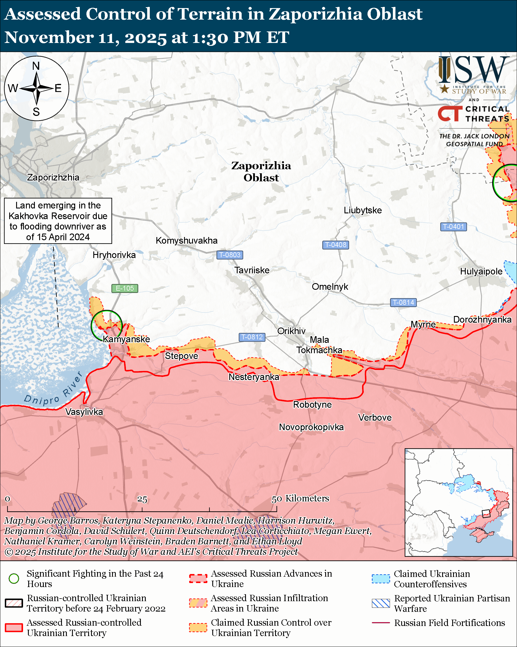 Russian forces are taking advantage of foggy weather conditions that degrade Ukrainian drone operations to intensify offensive operations in the Hulyaipole direction and other areas of eastern Ukraine. Geolocated footage published on November 11 indicates that Russian forces recently seized Okhotnyche (northeast of Hulyaipole).[xii] Ukrainian Southern Defense Forces Spokesperson Colonel Vladyslav Voloshyn reported on November 11 that Ukrainian forces withdrew from Uspenivka and Novomykolaivka and from positions near Okhotnyche, Novouspenivske, and Nove (all northeast of Hulyaipole).[xiii] Geolocated footage published on November 11 shows two Russian servicemembers raising flags in Novouspenivske in what ISW assesses was an infiltration mission that did not change the control of terrain or forward edge of the battle area (FEBA) at this time.[xiv] A source reportedly affiliated with Ukrainian military intelligence stated on November 10 that the contested "gray zone" in the Solodke-Novomykolaivka-Rivnopillya area (northeast of Hulyaipole) has grown significantly recently.[xv] Russian sources, including the Russian Ministry of Defense (MoD), claimed that Russian forces seized Novouspenivske.[xvi] Russian milbloggers claimed that Russian forces seized Solodke and advanced west of Zlahoda, to the eastern outskirts of Yablukove (all north of Hulyaipole), west of Novouspenivske, and east of Vesele (east of Hulyaipole).[xvii] Voloshyn stated that Russian forces are attempting to interdict Ukrainian ground lines of communication (GLOCs) that supply Hulyaipole from Pokrovske (north of Hulyaipole).[xviii] Voloshyn noted that Russian forces recently intensified artillery strikes in the Hulyaipole direction, firing roughly 2,000 shells in 400 artillery strikes per day ahead of the Ukrainian withdrawals.[xix]