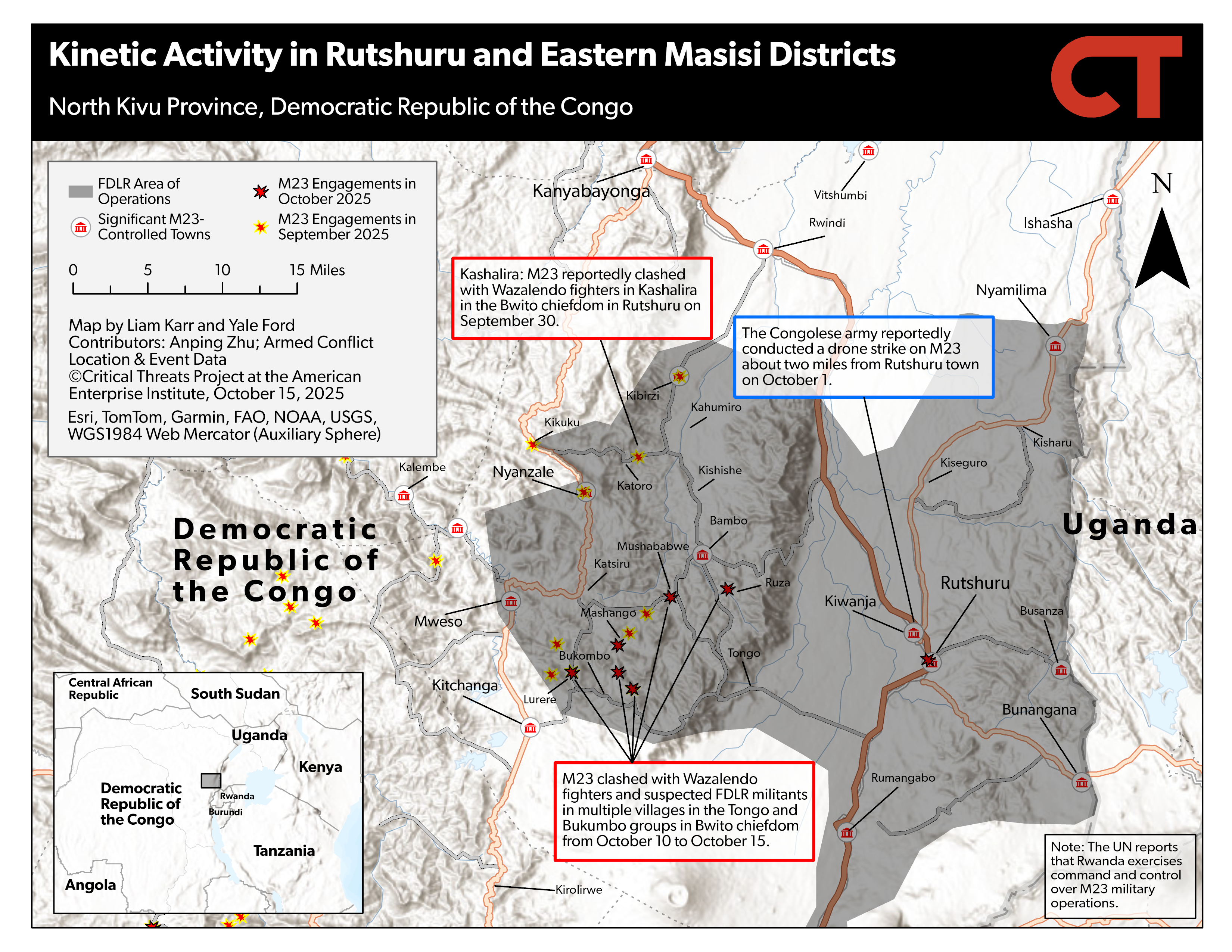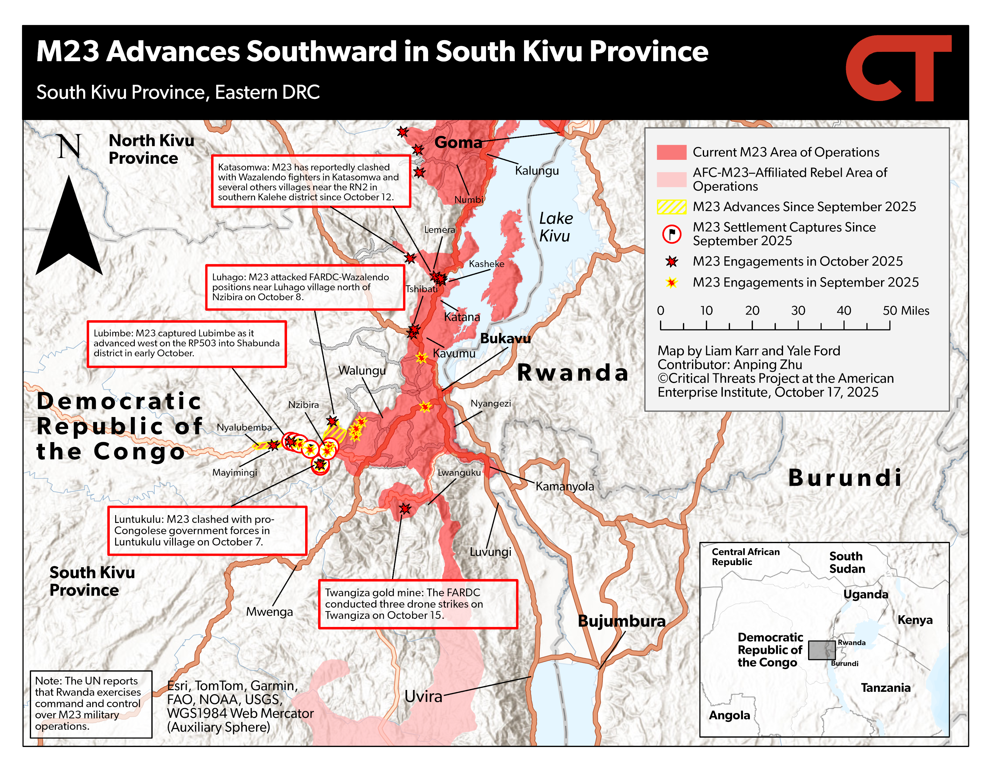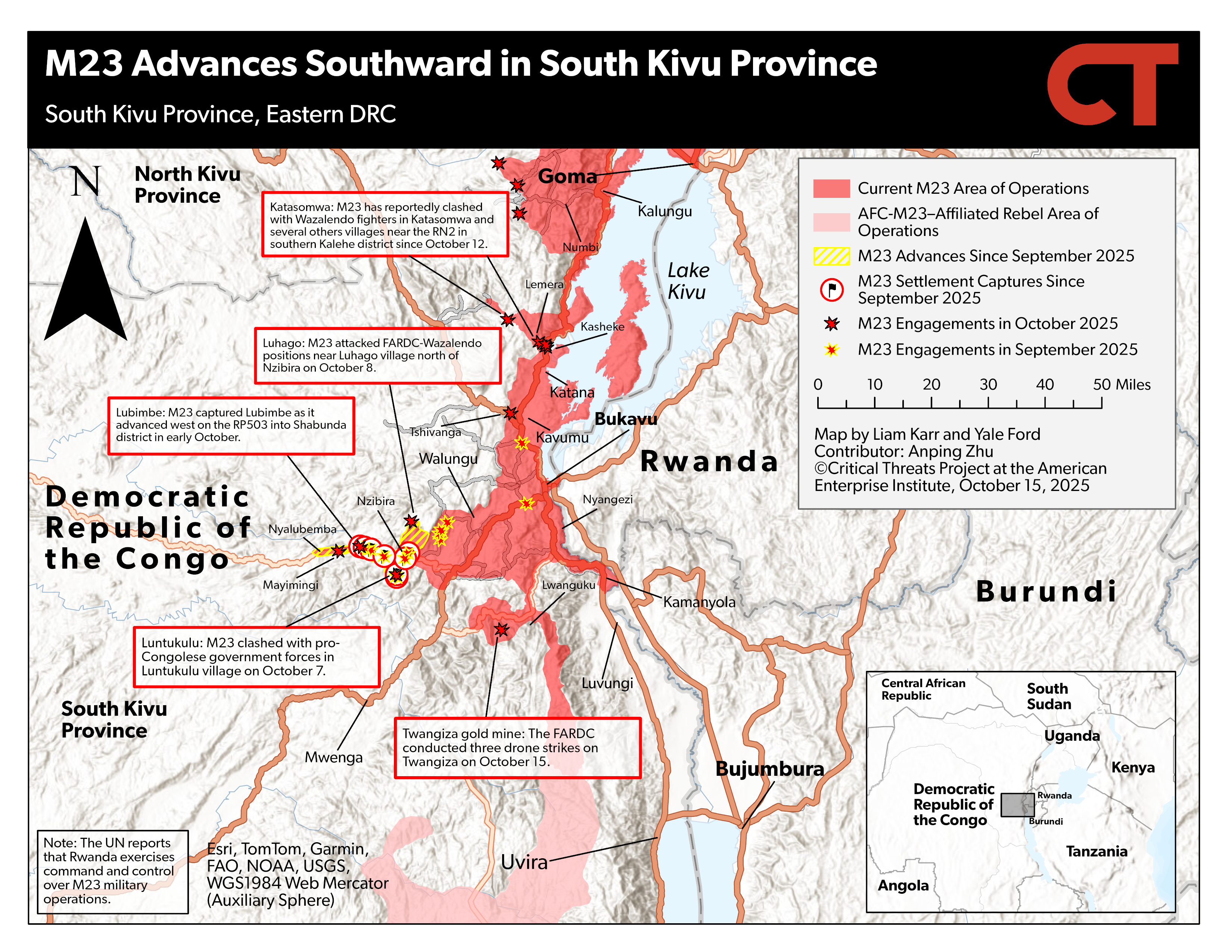 The Congolese army (FARDC) conducted several drone strikes on an M23-controlled industrial gold mine in Mwenga district in South Kivu. FARDC drones reportedly struck the Twangiza gold mine in the Luhwinja chiefdom in Mwenga in at least three bombing runs on October 15.[iv] The FARDC targeted the mine’s water storage and power generation facilities in the strikes, which reportedly disrupted operations.[v] M23 officials denounced the bombings as a violation of the Qatari-brokered ceasefire on social media on October 15.[vi] The FARDC bombed Twangiza in a previous strike but did not damage the site significantly last week.[vii] M23 seized the Chinese-owned mining site in early May 2025 and had reportedly restarted production in mid-July.[viii]