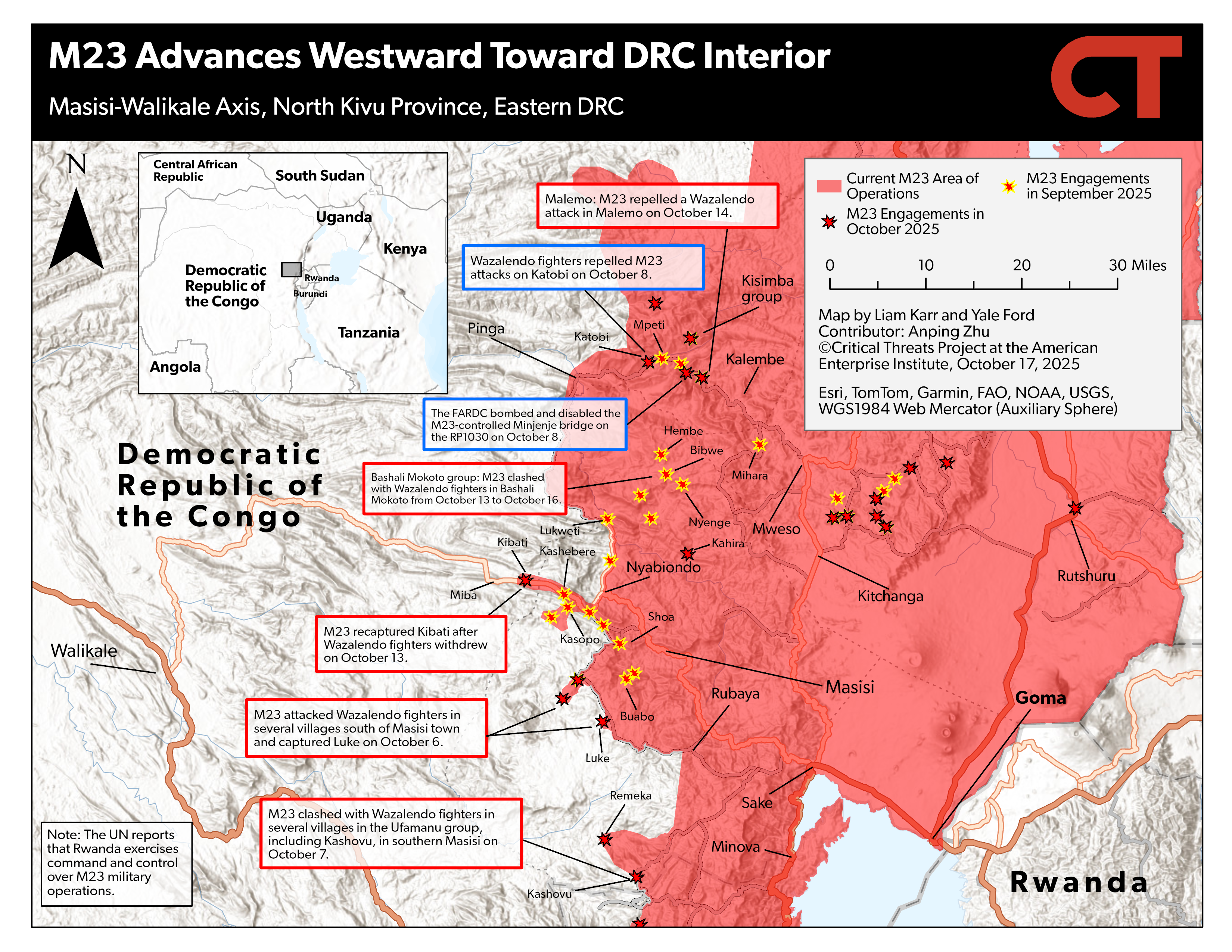 M23 repelled a Wazalendo attack on the RP1030 in northern Masisi district in North Kivu. M23 reportedly clashed with Wazalendos who then withdrew from Malemo village on the RP1030 on October 14.[xiii] Malemo is about 16 miles east from Pinga.