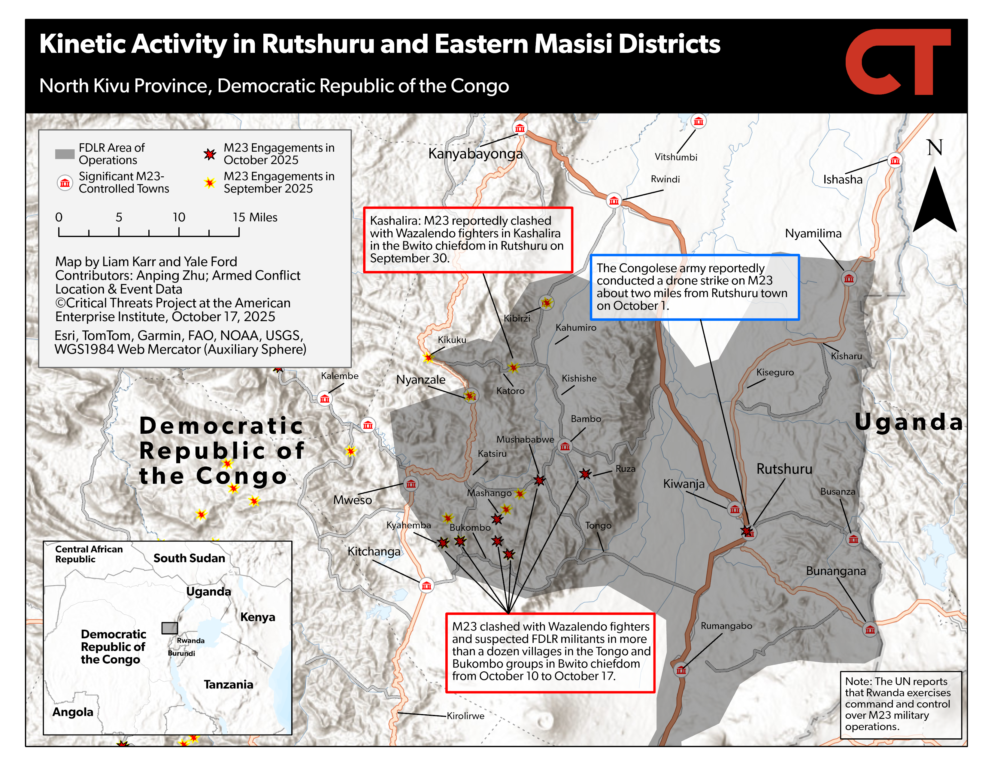 M23 launched counterinsurgency operations against pro-Congolese government Wazalendo fighters and suspected Forces démocratiques de libération du Rwanda (FDLR) militants in Rutshuru district in North Kivu. M23 clashed with Wazalendo fighters and suspected FDLR militants in at least three villages near Bambo village in the Tongo group in the Bwito chiefdom in Rutshuru from October 10 to October 12.[i] M23 has also reportedly conducted attacks and clashed with Wazalendo-FDLR fighters in at least a dozen villages near the Bukumbo group capital in Bwito since October 13.[ii] The Congolese media outlet Radio Okapi reported on October 13 that the renewed fighting near Bukombo displaced hundreds of people.[iii]