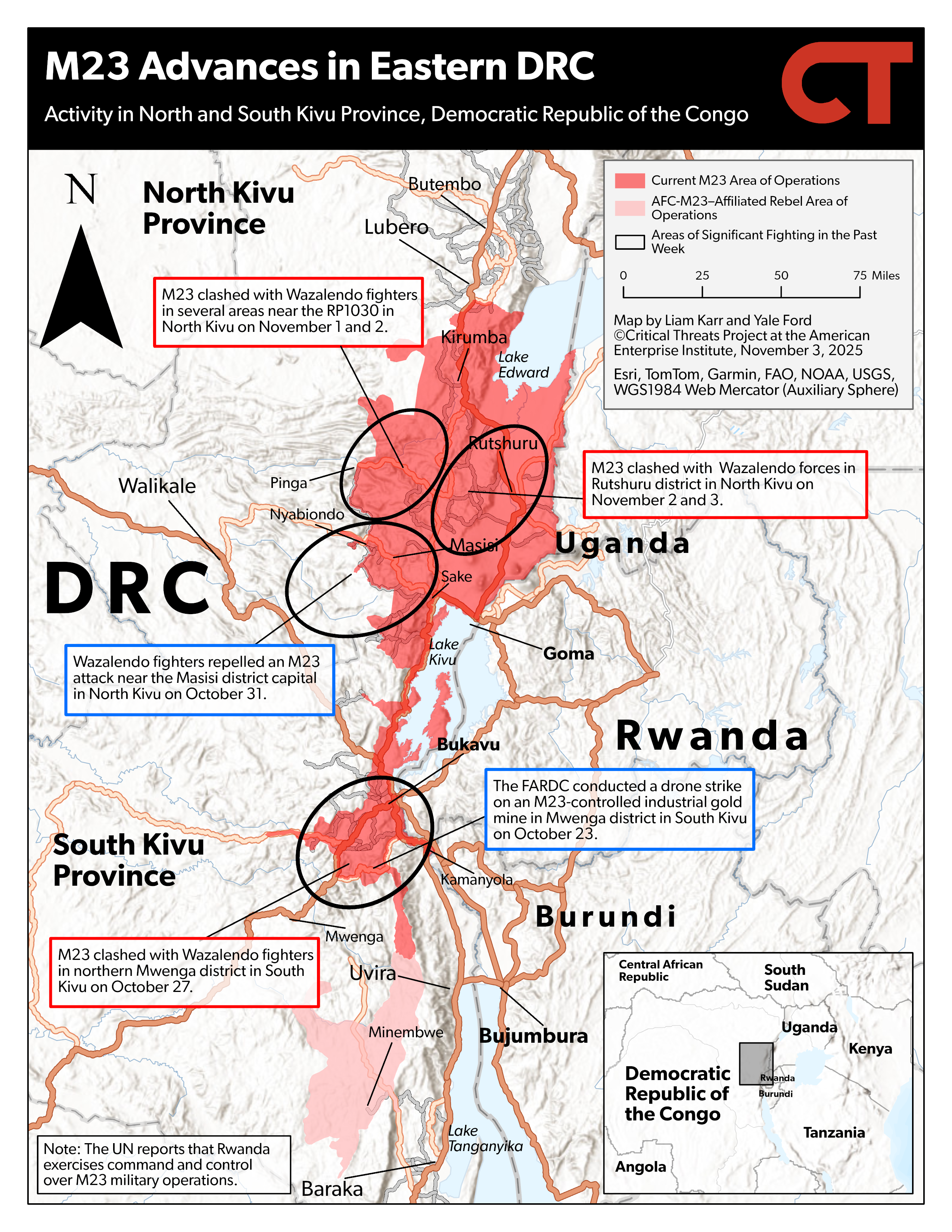 Wazalendo fighters repelled an M23 attack near the Masisi district capital in North Kivu. Actualite.cd reported that Wazalendo fighters repelled an M23 attack on the Buabo group, about nine miles southwest of Masisi, on October 31.[vi] M23 launched the attack on Buabo after it had taken control of a nearby village on October 30.[vii]