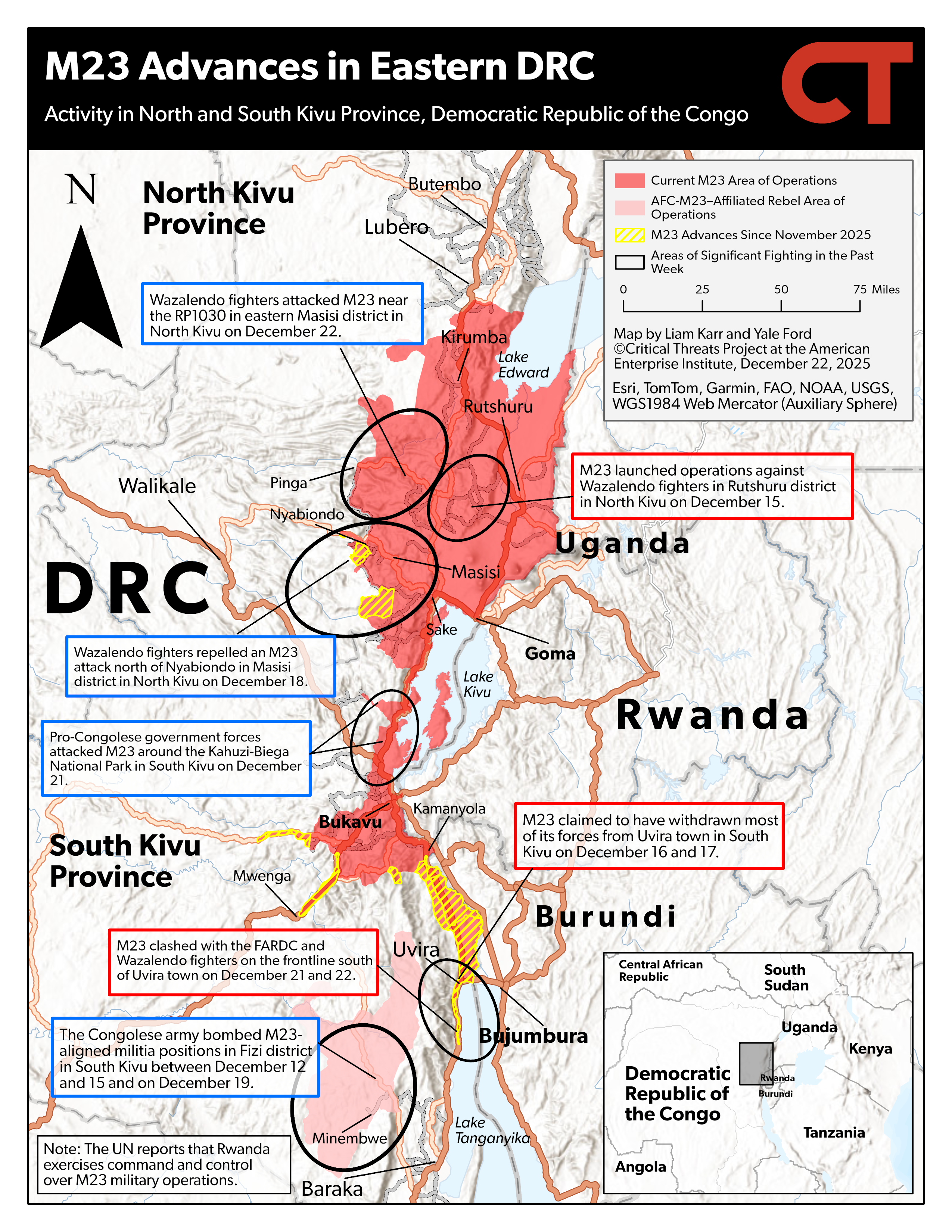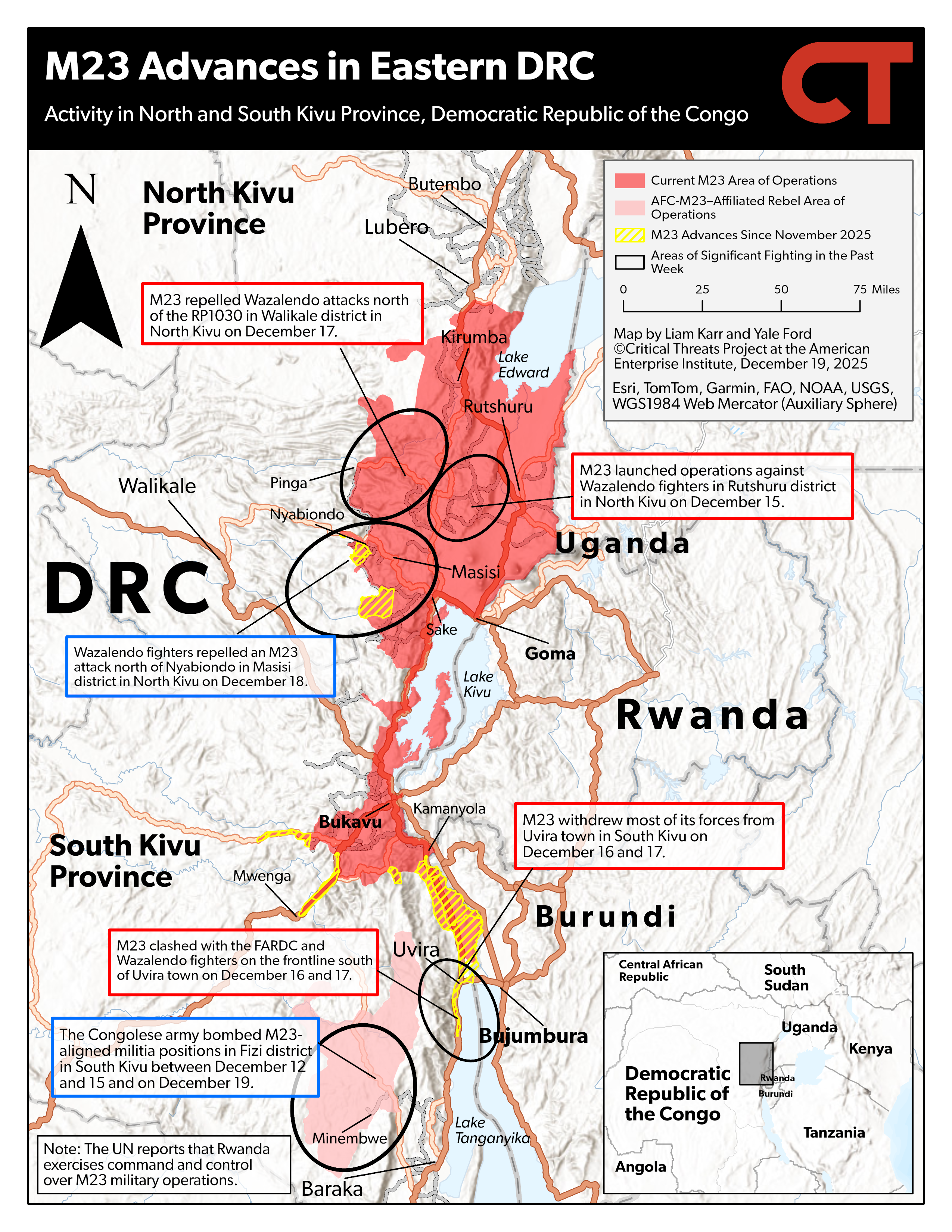 Key Takeaway: Uganda plans to host a regional peace and security conference on December 21. M23 withdrew unilaterally from Uvira town in South Kivu. M23 clashed with the Congolese army and pro-Congolese government Wazalendo fighters on the frontline south of Uvira town. Pro-Congolese government forces allegedly bombed an M23-controlled area in the South Kivu highlands.