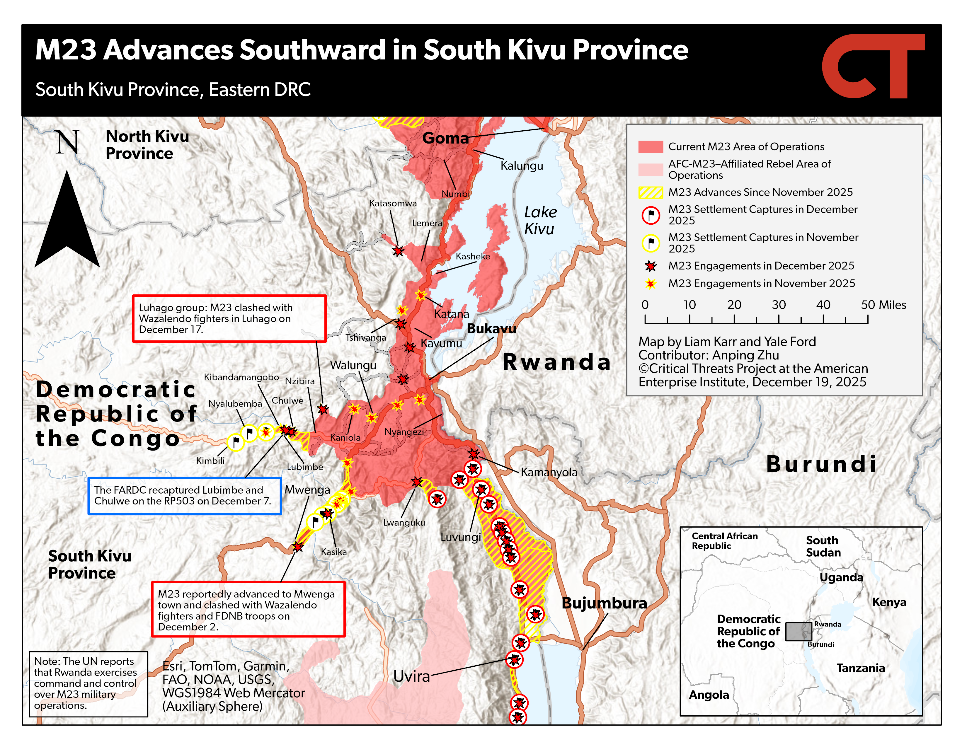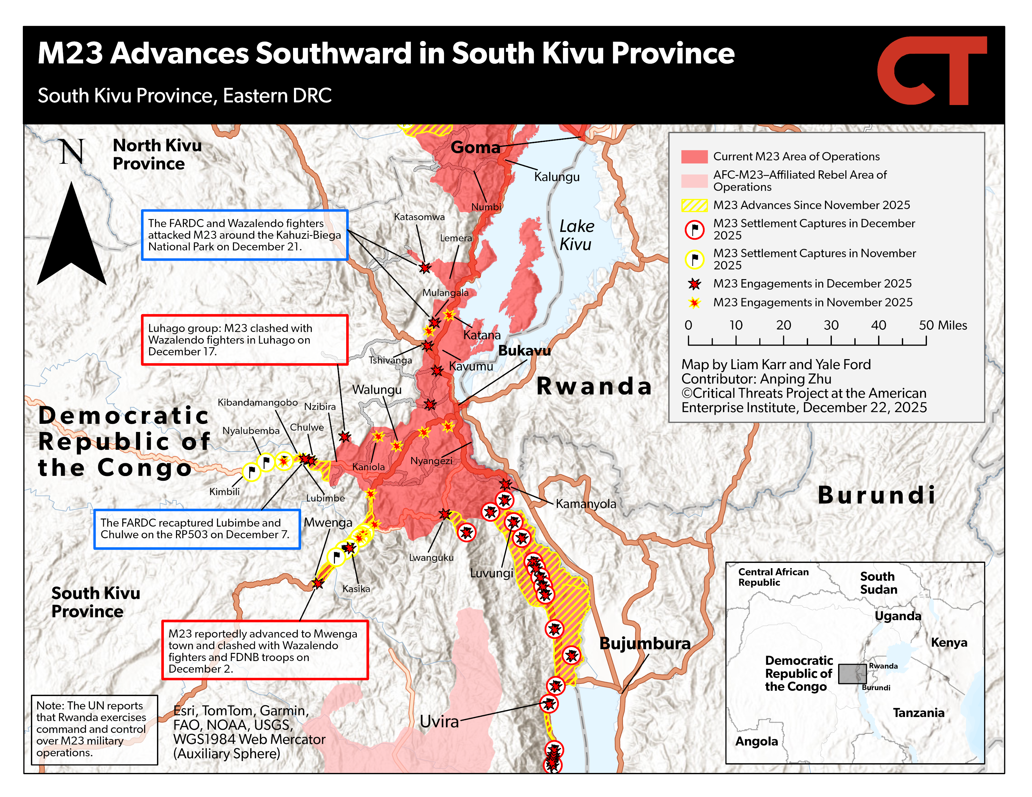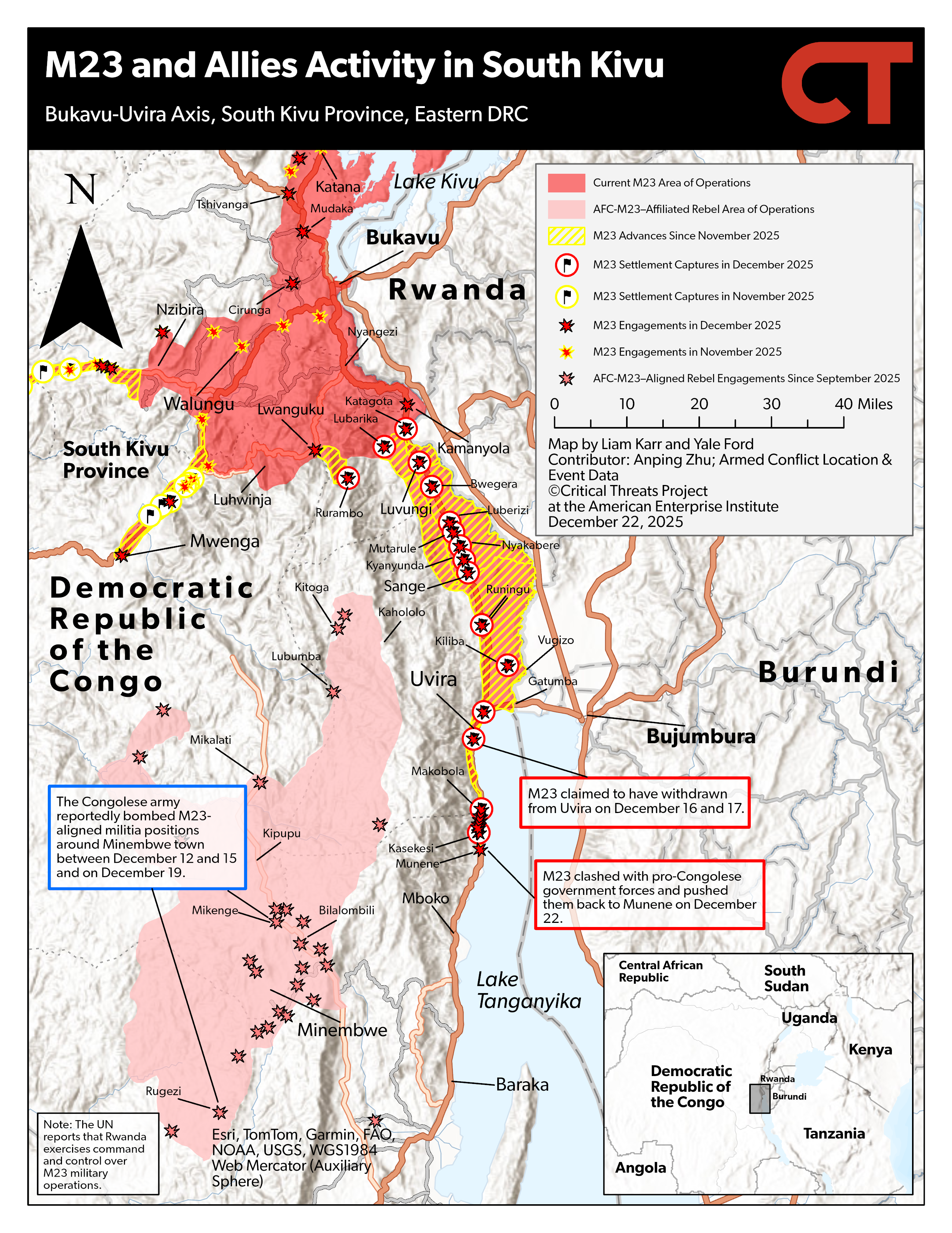 M23 announced a unilateral withdrawal from Uvira town in South Kivu. Corneille Nangaa, the head of M23’s political branch, Alliance Fleuve Congo, said that M23 committed to unilaterally withdraw from Uvira in a statement on December 15.[iii] Nangaa called the move a “unilateral trust-building measure” and a sign of its commitment to “give Doha the maximum chance to succeed.”[iv] Nangaa said that M23 made the decision to withdraw in response to a request from the United States.[v] Nangaa called on the United States and the “guarantors of the peace process” to “demilitarize” Uvira, protect locals and infrastructure, and deploy a “neutral force” that will monitor a ceasefire before M23 forces withdraw.[vi] The M23 military spokesperson told Reuters on December 17 that M23 was “ready to leave [Uvira], but our conditions have to be reviewed” first.[vii]