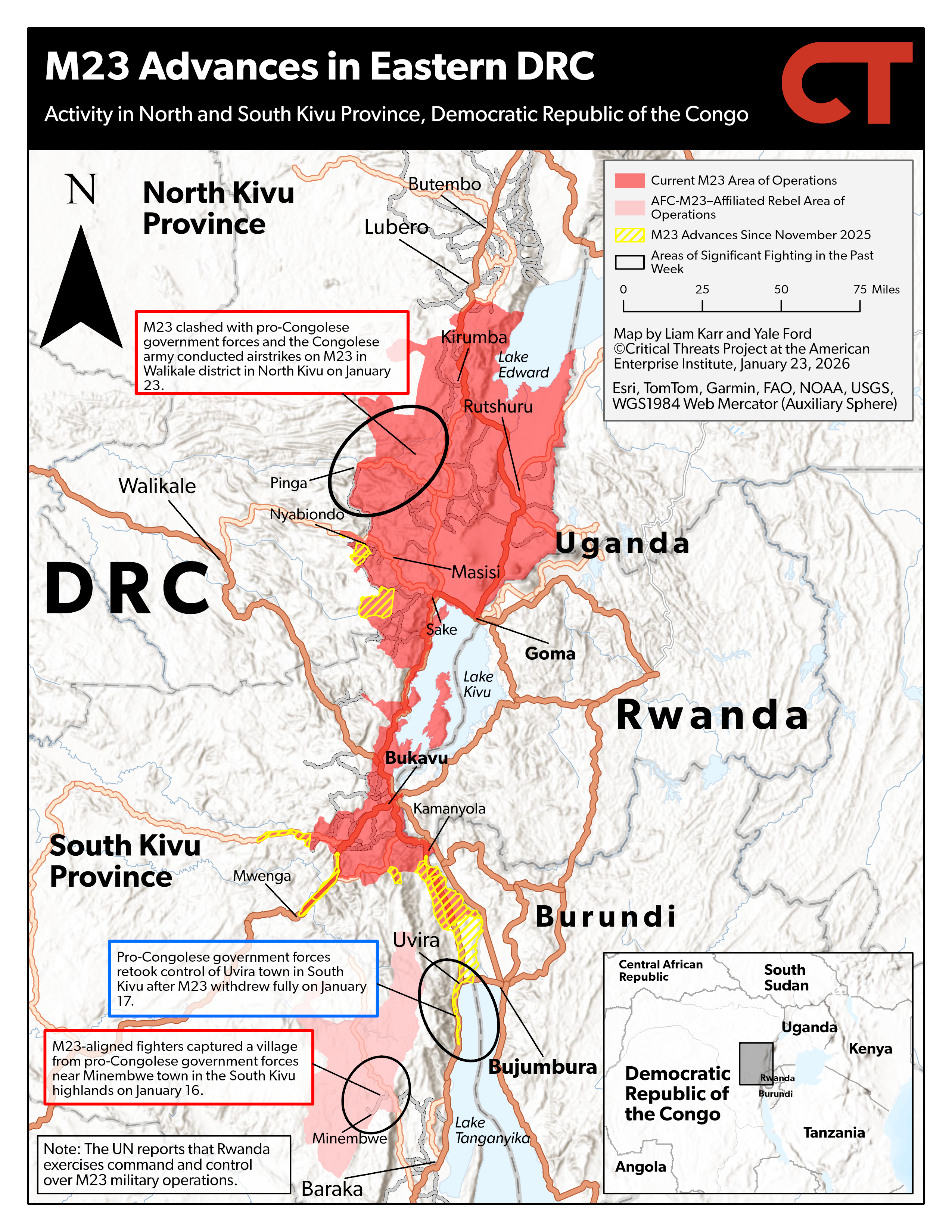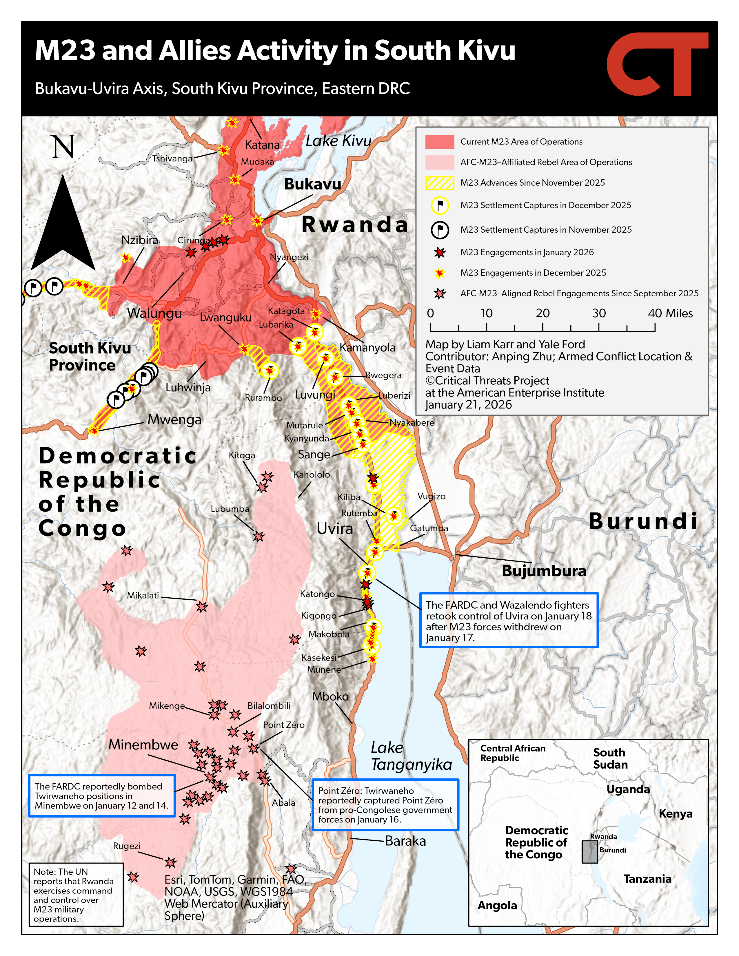 [v] https://x.com/afrikarabia/status/2011918329707901172; https://x.com/Conspiracygl/status/2012580454587678732; https://www.youtube.com/live/HvhLj-_RviY; https://x.com/HeritierBarak/status/2012778625523687780; https://x.com/ligodipatient/status/2012575956536377541; https://www.rfi.fr/fr/afrique/20260118-est-de-la-rdc-des-colonnes-de-combattants-afc-m23-quittent-la-ville-d-uvira; https://afrique.lalibre.be/79934/rdc-les-rebelles-contraints-dabandonner-uvira; https://www.criticalthreats.org/analysis/m23-withdraws-from-uvira-saudi-uae-red-sea-competition-al-shabaab-attacks-mogadishu-rsf-genocide-el-fasher-africa-file-december-18-2025#DRC; https://www.ft.com/content/1ca7eb4a-2b51-4645-b600-9d7d72783fd8; https://www.reuters.com/world/africa/us-not-satisfied-with-m23-withdrawal-congo-town-official-says-2025-12-23; https://www.rfi.fr/fr/afrique/20251225-rdc-impatience-de-l-administration-trump-face-au-non-retrait-du-m23-de-la-ville-d-uvira; https://afrique.lalibre.be/79934/rdc-les-rebelles-contraints-dabandonner-uvira