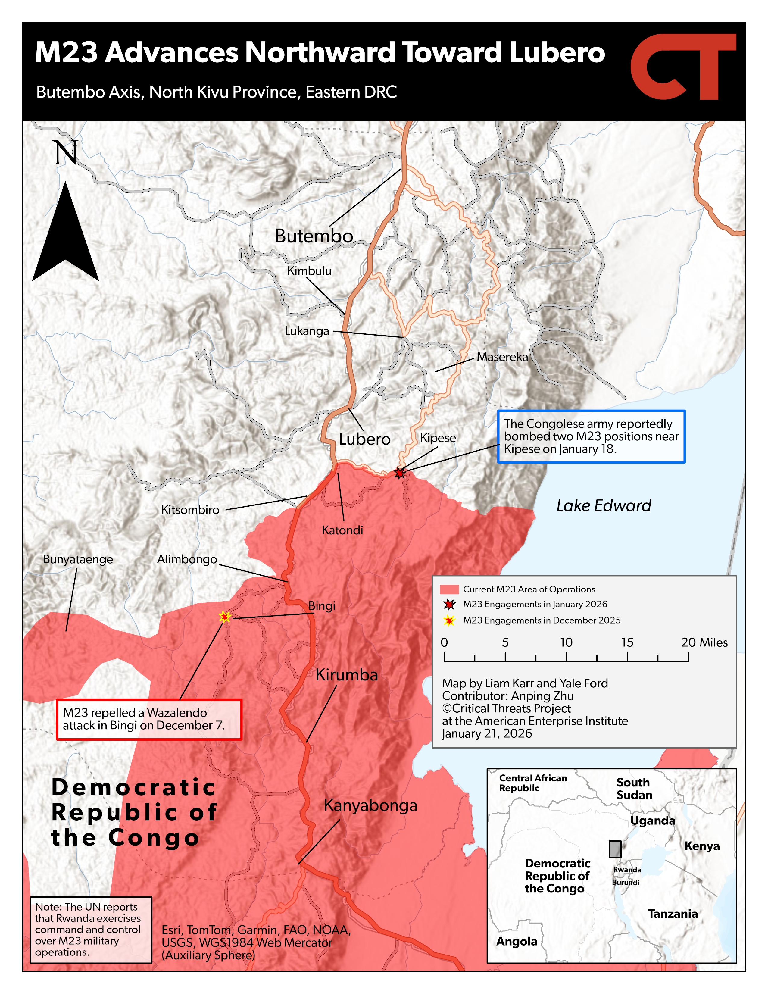 M23 clashed with pro-Congolese government forces north of the RP1030 in Walikale district in North Kivu. The Congolese media outlet Actualite.cd reported that M23 attacked the FARDC and Wazalendo fighters in two villages in the Kisimba group, including Mpombi— two miles north of Mpeti, M23’s forward position on the RP1030—on January 21.[xiii] M23 has tried to capture Mpombi, a key town held by pro-Congolese government forces on the Mpeti-Pinga axis, on several occasions since late November 2025, including on January 13.[xiv] An FARDC attack drone reportedly conducted an airstrike on an M23 position north of Mpombi on the northern edge of Kisimba near Rusamambu village—about 10 miles northeast of Pinga—on January 19.[xv]