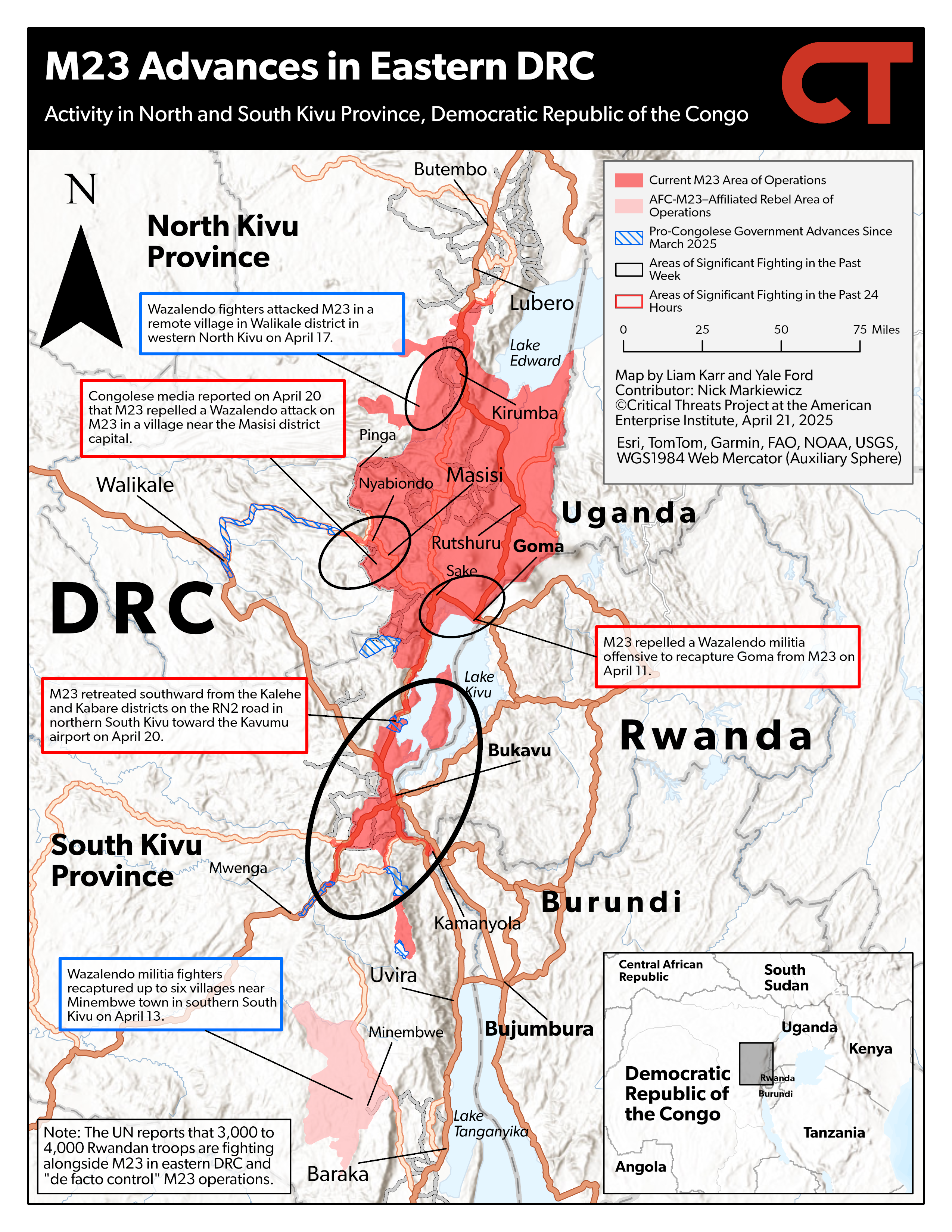 M23 rebels clashed with pro-Congolese government Wazalendo fighters in a village on the outskirts of Bukavu, the South Kivu provincial capital. Independent Congolese journalist Byobe Malenga reported that M23 clashed with Wazalendo fighters in Nyangezi—about 15 miles south of Bukavu on the RN5 road—using heavy and light weaponry on April 21.[5] M23 has clashed with Wazalendos in Nyangezi since mid-March, and Congolese journalists claimed on social media in early April that Wazalendo fighters had recaptured Nyangezi.[6] The Congolese news outlet Radio Okapi reported on April 18 that M23 has been “increasing their numbers day by day” in South Kivu province and that Bukavu and rural villages on the provincial capital’s outskirts—including Nyangezi—have been heavily militarized and seen “an impressive reinforcement of rebel troops” since last week.[7]