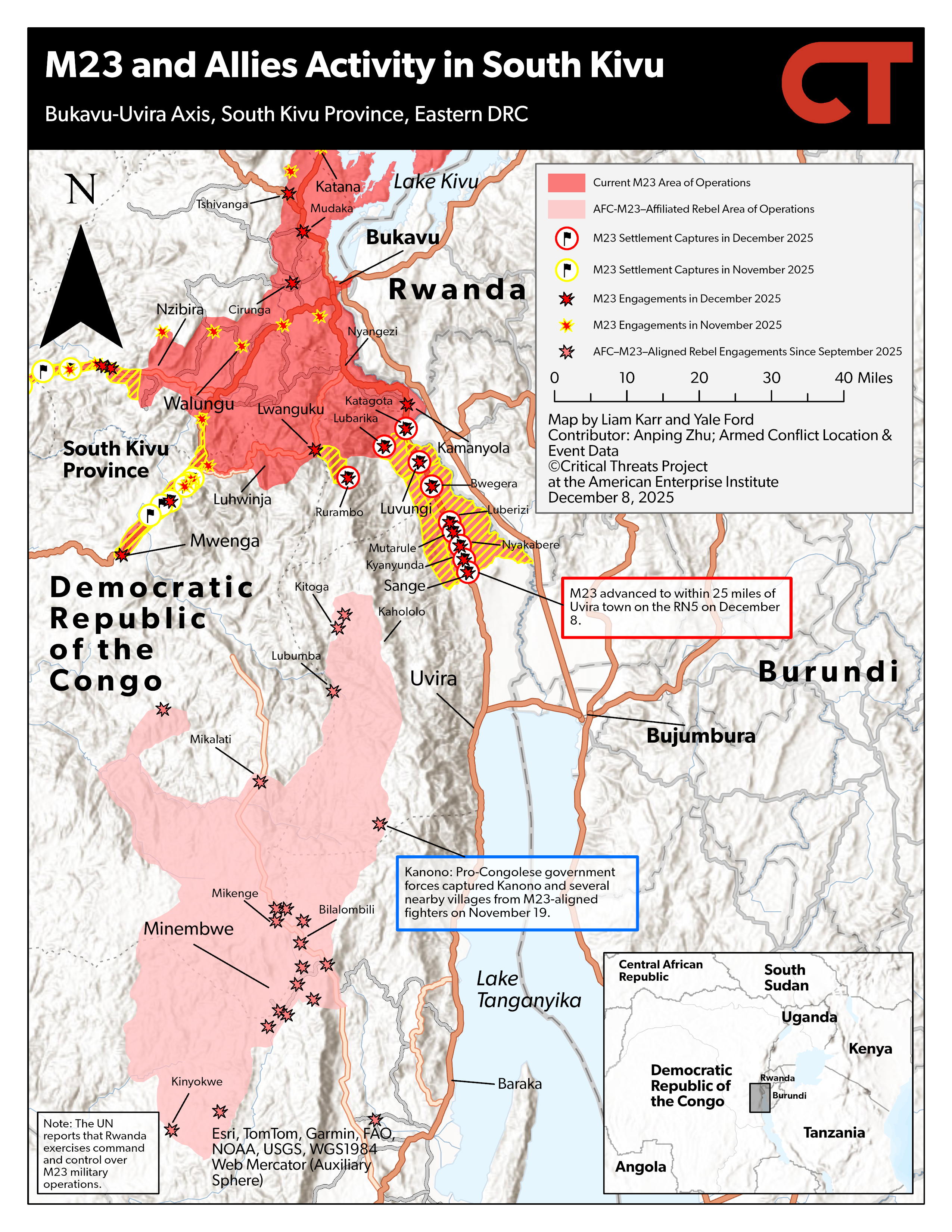 [iii] https://www.rfi.fr/fr/afrique/20251206-rdc-malgr%C3%A9-l-accord-de-paix-de-washington-les-combats-se-poursuivent-au-sud-kivu; https://x.com/HeritierBarak/status/1997766209316499663; https://x.com/Kivuinfo24/status/1997763142345208016; https://x.com/wembi_steve/status/1997761873966760036; https://x.com/kivunewstoday/status/1998028342021243143; https://x.com/StanysBujakera/status/1997979264054947875; https://x.com/Kivuinfo24/status/1997964137109090451; https://x.com/wembi_steve/status/1997963614255542554; https://x.com/RutegaBin/status/1997957934962139421; https://x.com/SMupfuni/status/1997957040434741614; https://x.com/etiennemulindwa/status/1997652019520143537; https://x.com/etiennemulindwa/status/1997637275245535263; https://actualite dot cd/2025/12/06/rdc-uvira-les-rebelles-de-lafcm23-prennent-le-controle-de-luvungi; https://x.com/VoiceOfCongo/status/1997429919681228857; https://x.com/YvesBuya1/status/1997420037326381377; https://x.com/kivunewstoday/status/1997375590572146848; https://x.com/GeorgesKisando/status/1997365470429605907; https://x.com/StanysBujakera/status/1997341344545538190; https://x.com/wembi_steve/status/1997262051429974375; https://www.criticalthreats.org/briefs/congo-war-security-review/december-5-2025
