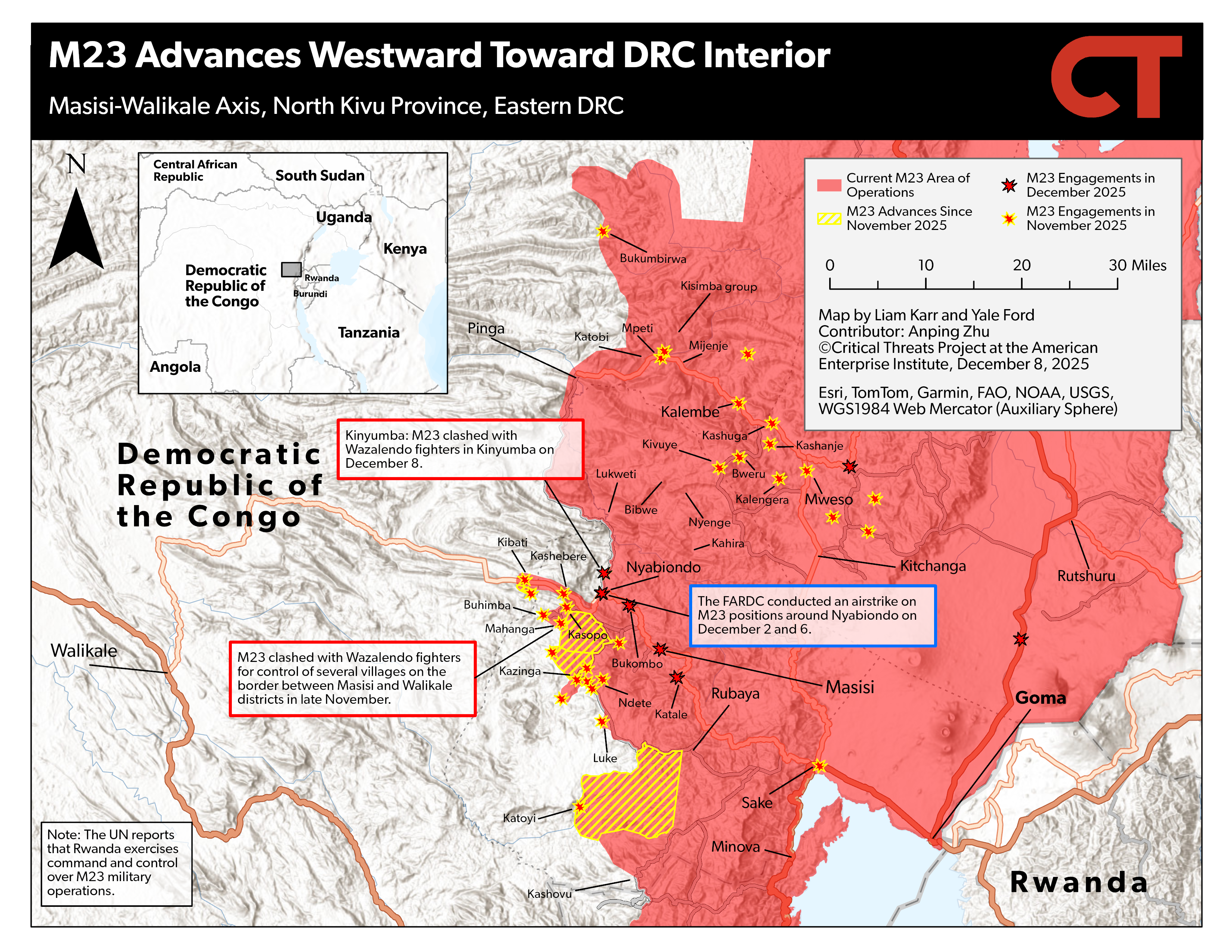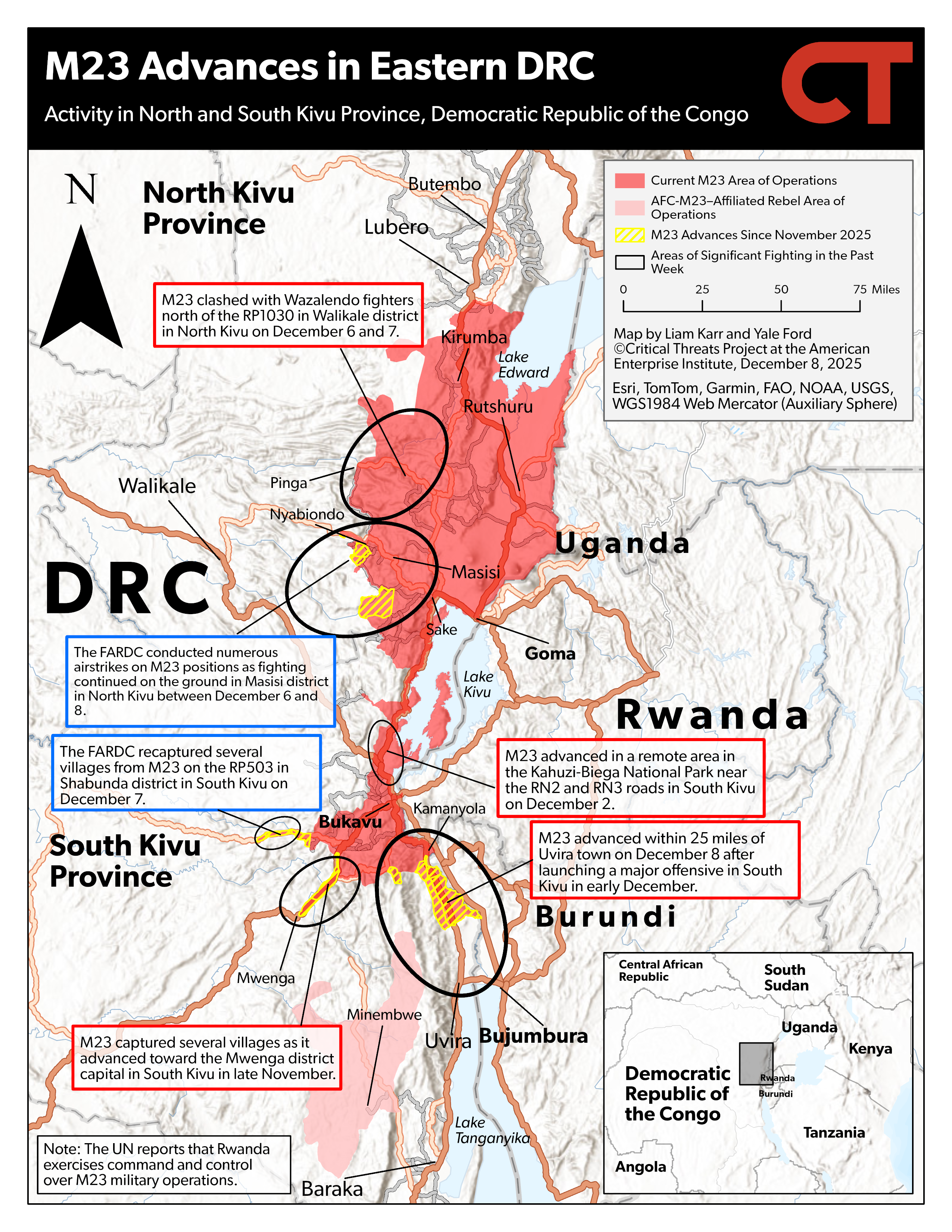 The FARDC conducted numerous airstrikes on M23 positions as fighting continued on the ground in Masisi district in North Kivu. An FARDC attack drone struck two M23 positions in Nyabiondo town on the RP529 on December 6.[xvii] The FARDC had conducted a previous airstrike on M23 near Nyabiondo last week on December 2.[xviii] An FARDC drone then reportedly bombed two M23 positions in Masisi town on December 7.[xix] An FARDC drone also bombed an M23 garrison in Bukombo village, which is about halfway between Nyabiondo and Masisi town on the RP529, on December 7.[xx] The FARDC then targeted an M23 position about seven miles south of Masisi in Katale village on the RP529 on December 8.[xxi] Fighting on the ground in Kinyumba—about three miles north of Nyabiondo—resumed, when M23 reportedly tried to recapture the village from Wazalendo fighters on December 8.[xxii] Wazalendo fighters had captured Kinyumba during an offensive in late November.[xxiii]