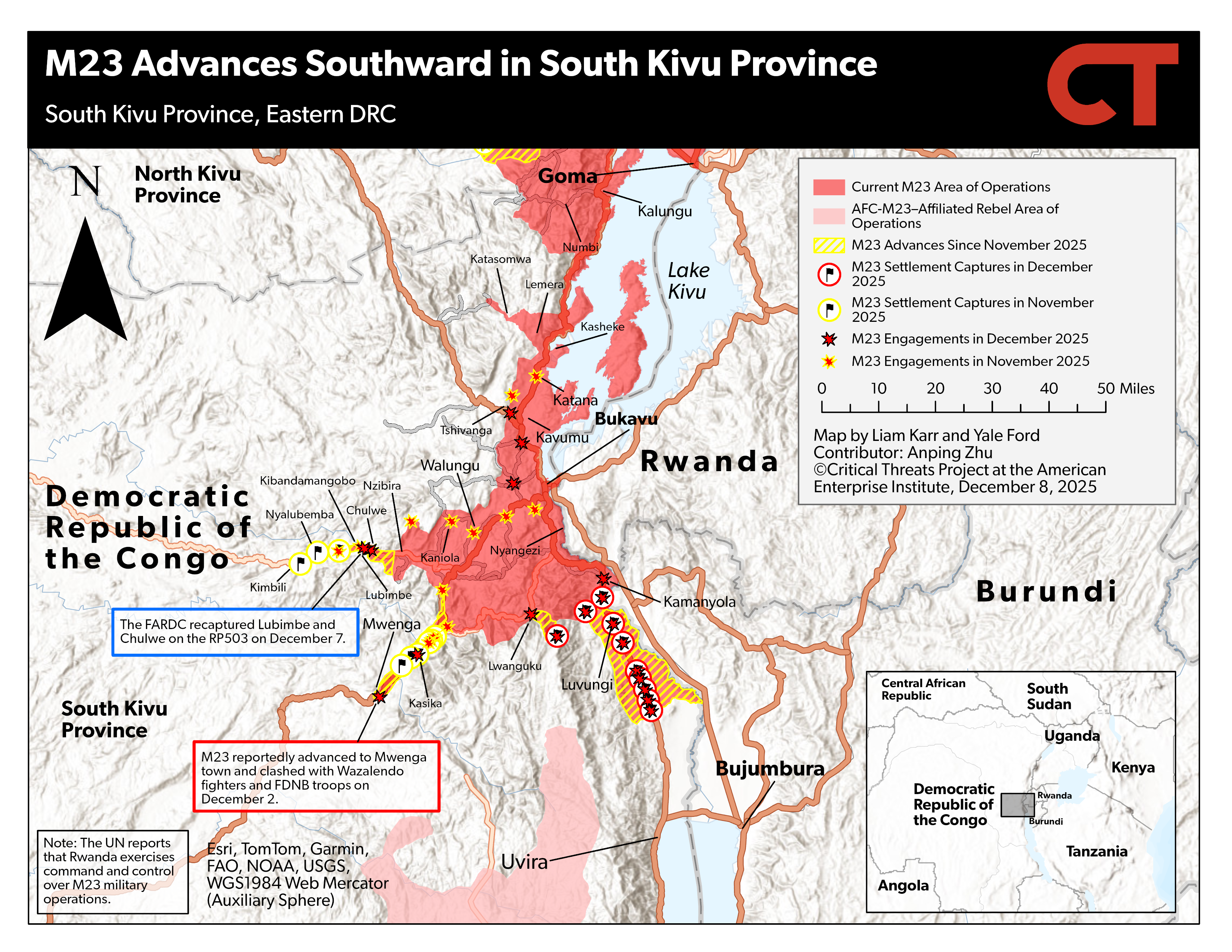 M23 advanced rapidly toward Uvira town on the RN5 in South Kivu. M23 reportedly advanced about four miles south of its position on the RN5 in Luvungi, which it had captured between December 5 and 7, and took control of Bwegera village on December 7.[iii] Burundian army (FDNB) and Congolese army (FARDC) troops and Wazalendo fighters retreated about six miles south of Luvungi to Luberizi on the RN5 around December 6.[iv] M23-aligned forces reportedly captured Rurambo village, roughly 13 miles west of Luvungi in the Uvira highlands, in a supporting effort on December 6, after pro-Congolese government forces withdrew from the area.[v] A significant number of FDNB troops reportedly began withdrawing from the Ruzizi Plain around December 6 after sustaining dozens of casualties in recent days—including the highest ranking Burundian officer in the DRC and several junior officers in an M23 drone strike on December 4.[vi] M23 reportedly captured several FDNB troops as the group advanced down the RN5.[vii] Infighting between FARDC-Wazalendo units near Sange village—about 17 miles south of Luvungi—reportedly resulted in the deaths of dozens of people on December 7 and 8, as the defense against M23 collapsed.[viii] M23 overran pro-Congolese government positions in Luberizi and advanced another 13 miles from Bwegera to capture at least three villages on the RN5 before reaching Sange and capturing the town on December 8.[ix] Sange is about 25 miles north of Uvira. Burundian media reported that Congolese civilians and FARDC-Wazalendo fighters and FDNB troops began fleeing Uvira town “en masse” on December 8.[x]