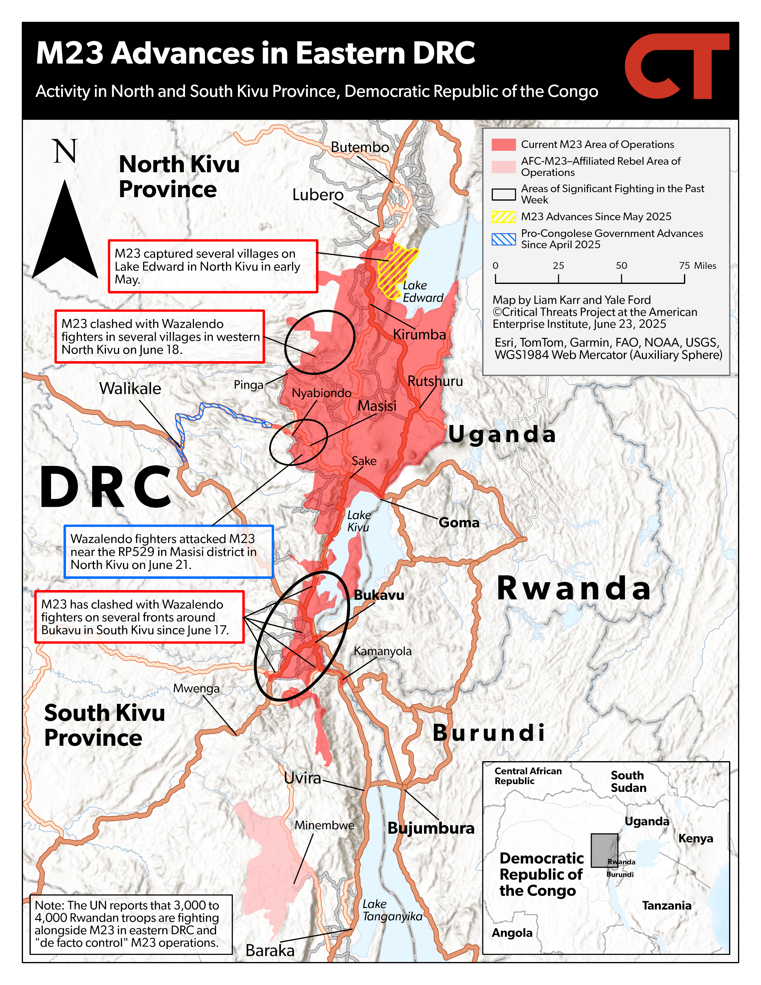 Key Takeaway: M23 clashed with pro-Congolese government Wazalendo fighters in Walungu district in South Kivu nearly every day the past week. DRC President Félix Tshisekedi met with Congolese religious leaders to discuss a national dialogue. Wazalendo fighters attacked M23 near the RP529 in Masisi district in North Kivu.
