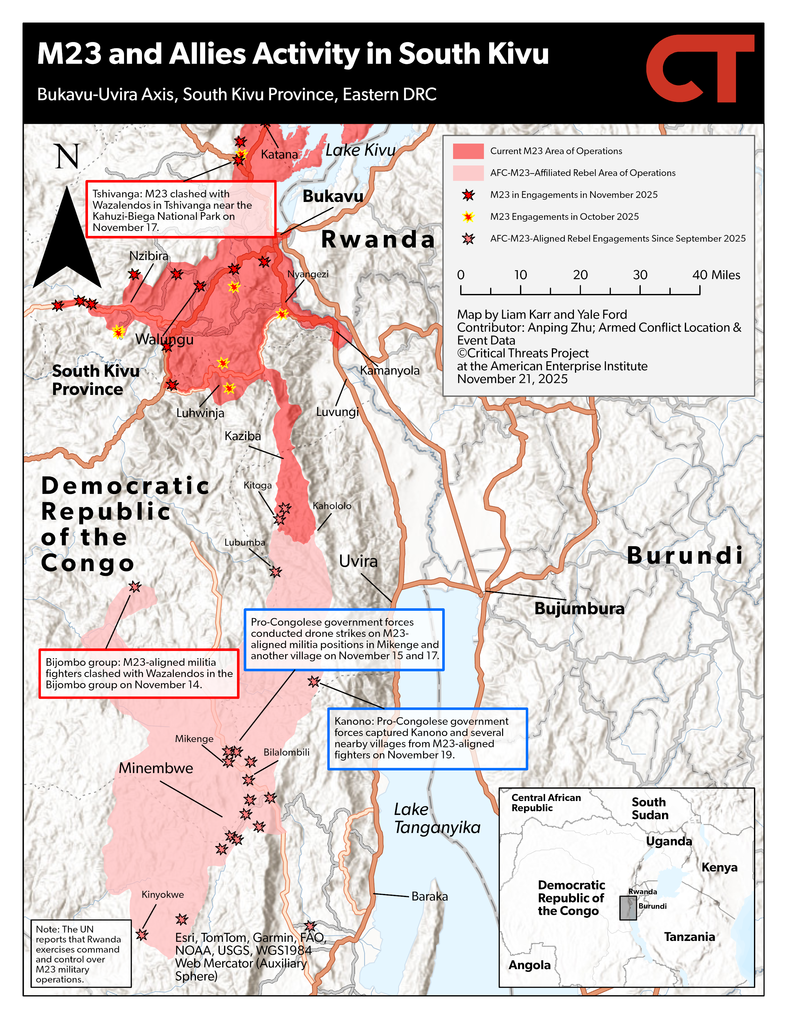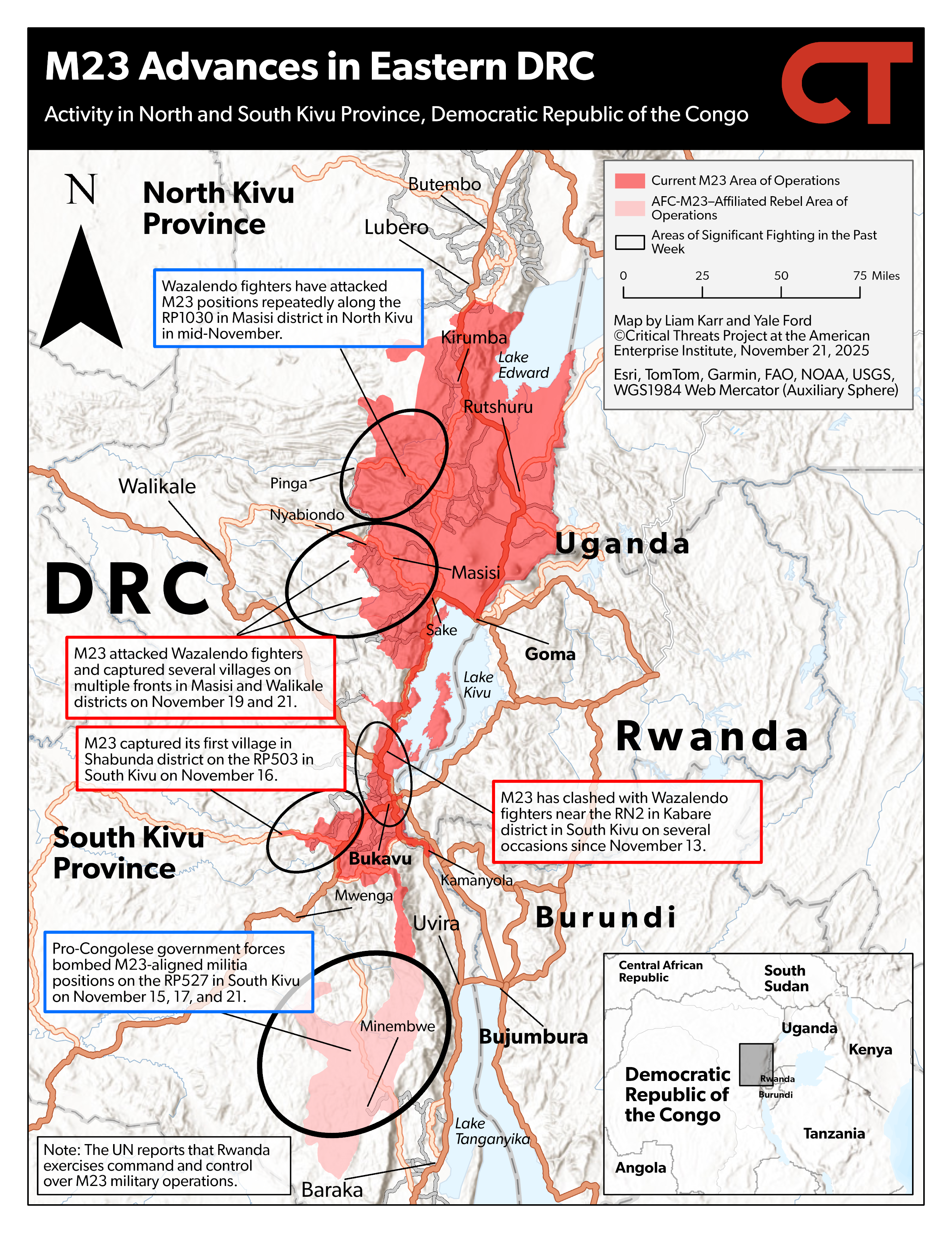 An in-depth review of activity related to the war in the eastern DRC between M23 and its Rwandan backers and pro-Congolese government forces every Monday, Wednesday, and Friday. Map shapefiles are available by request via email at [email protected].