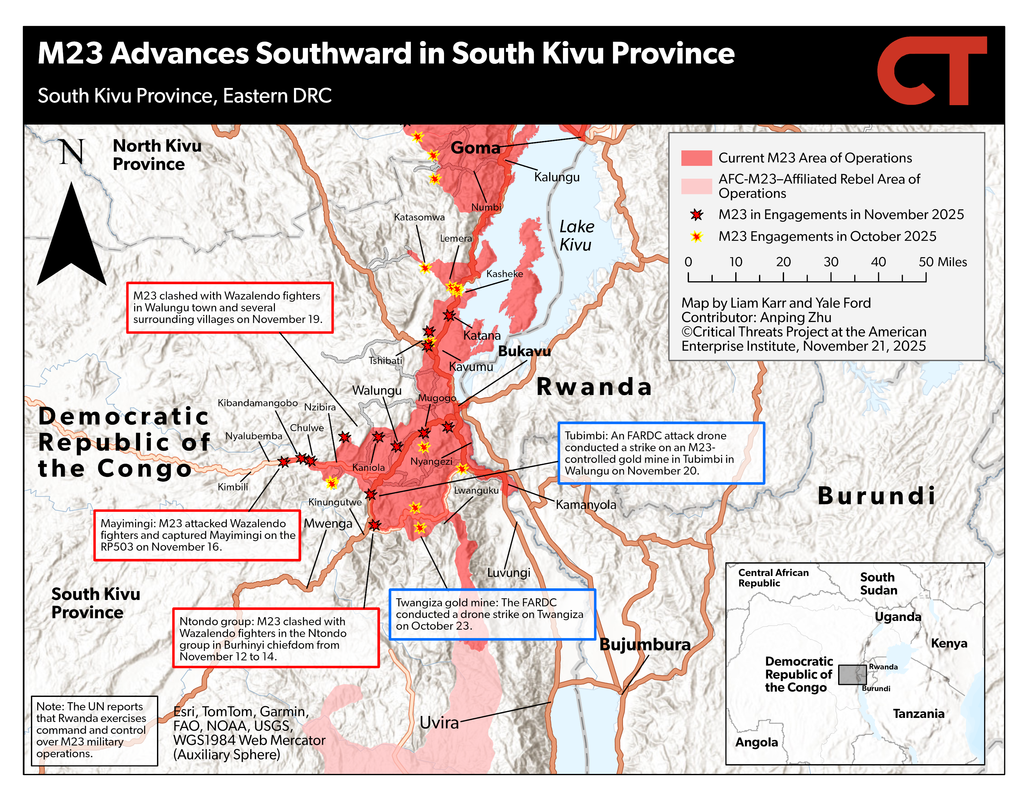 Twirwaneho fighters attacked pro-Congolese government Wazalendo fighters in the South Kivu highlands. Twirwaneho fighters reportedly attacked Wazalendos in three villages south of Minembwe, including Kinyokwe, on November 21.[iii] Kinyokwe is roughly 22 miles southwest of Minembwe in Fizi.