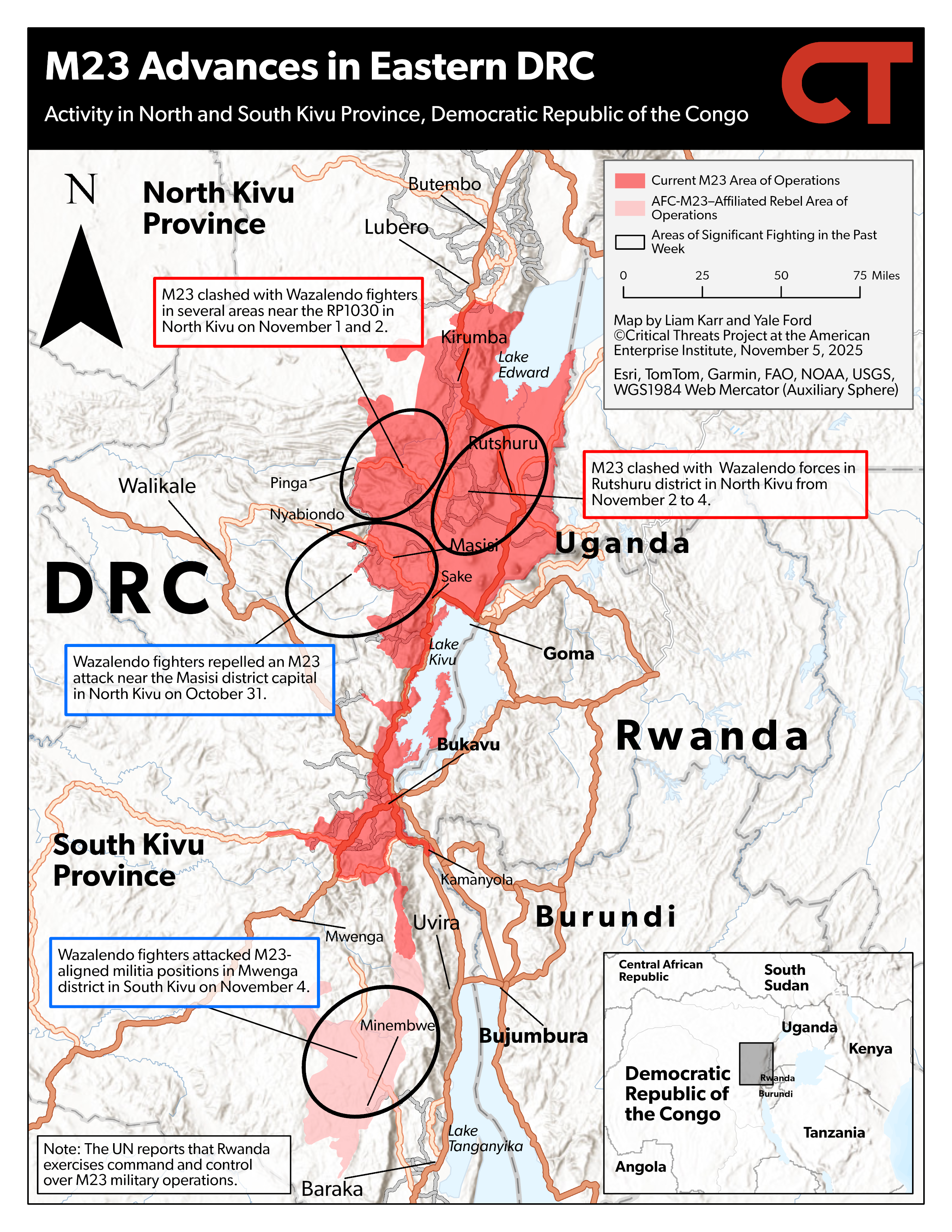 An in-depth review of activity related to the war in the eastern DRC between M23 and its Rwandan backers and pro-Congolese government forces every Monday, Wednesday, and Friday. Map shapefiles are available by request via email at [email protected].