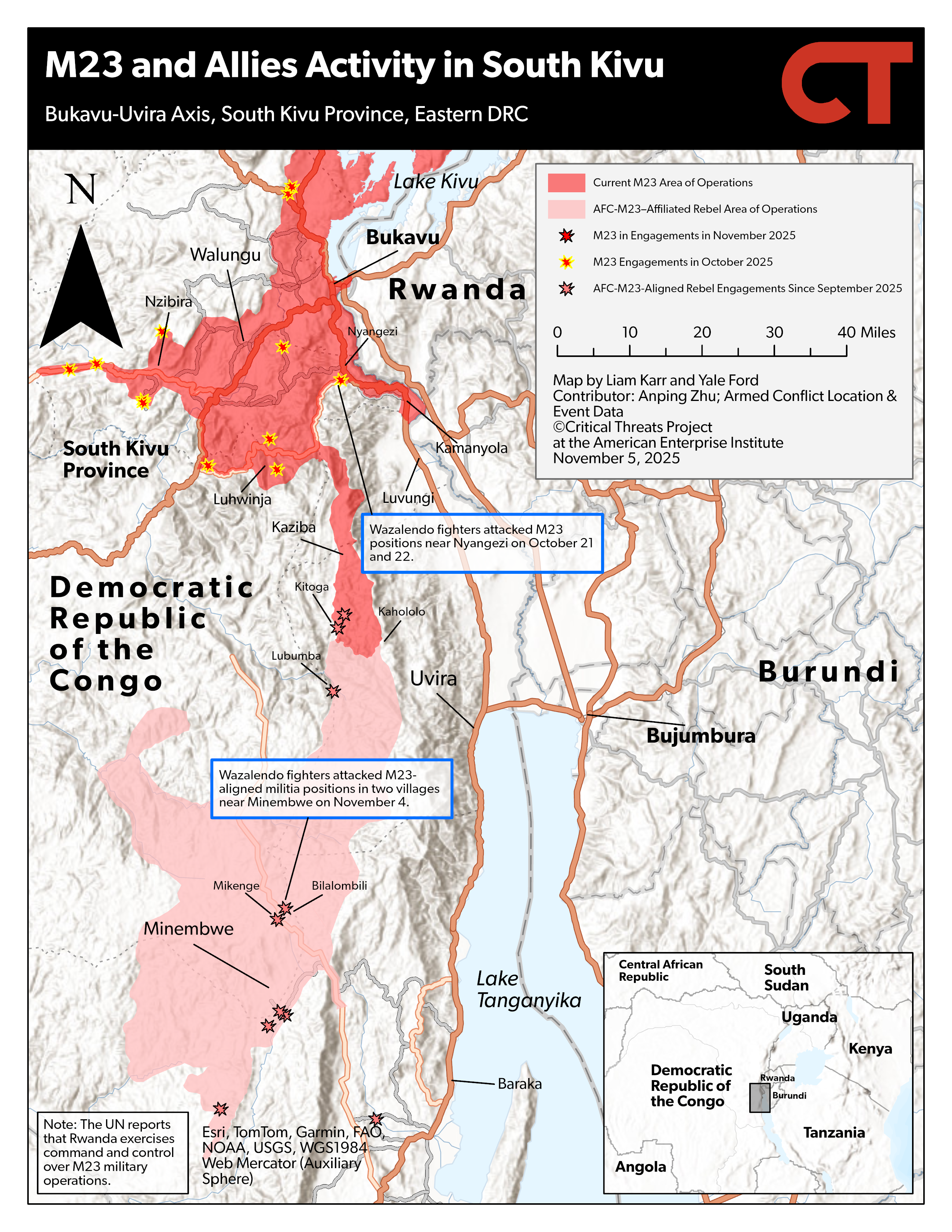 Wazalendo fighters attacked M23-aligned militia positions in Mwenga district in South Kivu. Wazalendo fighters reportedly attacked M23-aligned Twirwaneho militia positions north of Minembwe town in Mikenge and Bilalombili villages on the RP527 in the Fizi highlands in Mwenga on November 4.[iii]