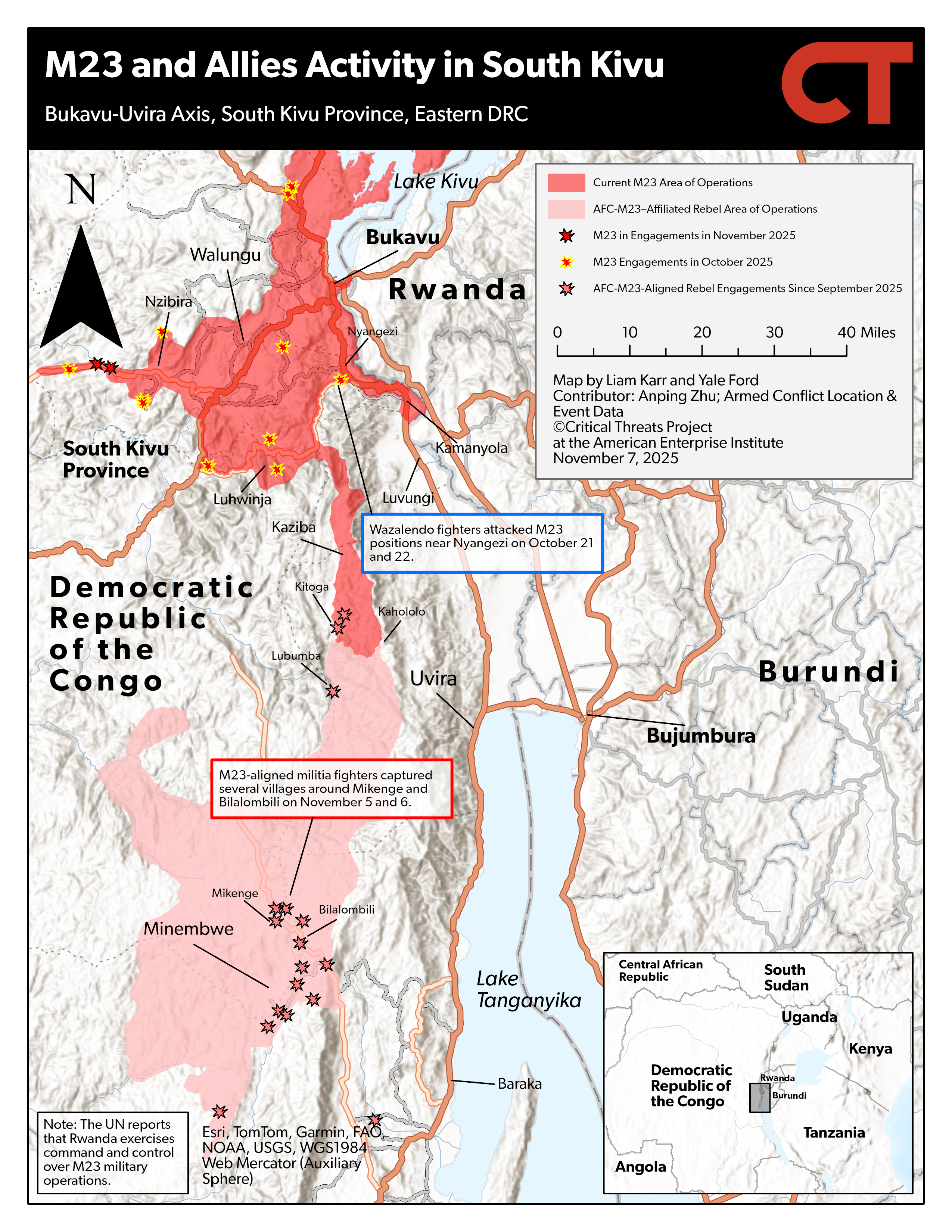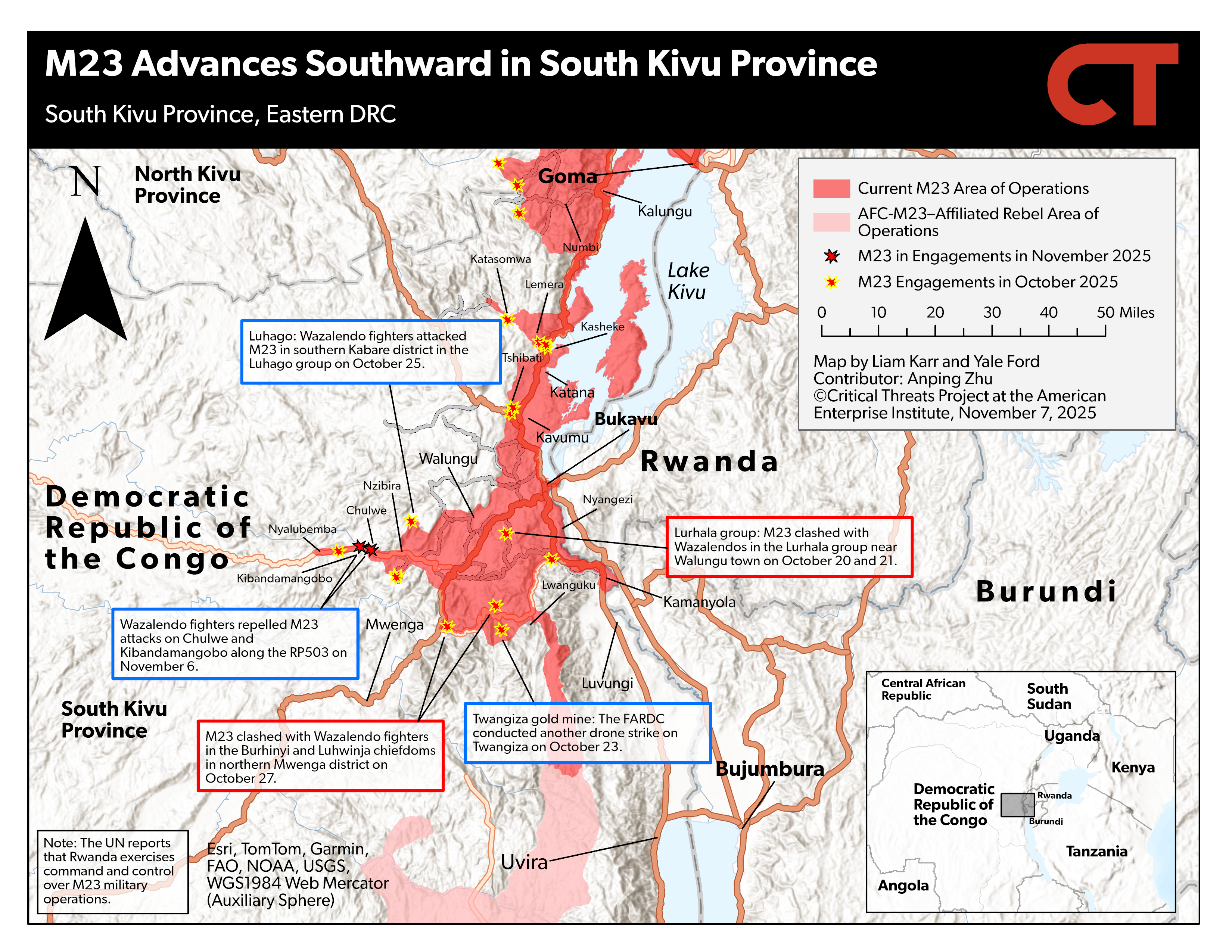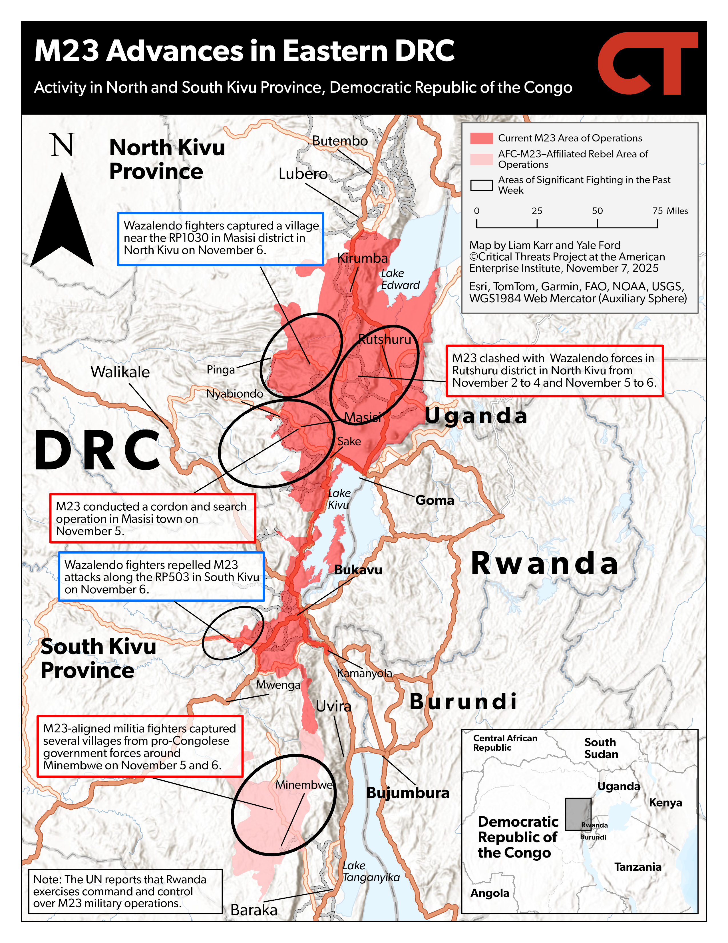 Wazalendo fighters repelled M23 attacks along the RP503 in South Kivu. The Congolese media outlet Tazama RDC reported that Wazalendo fighters repelled M23 attacks on Chulwe and Kibandamangobo villages along the RP503 in Kabare and Walungu districts, respectively, on November 6, marking the first significant kinetic activity on the RP503 since early October.[xi] The two villages are about 11 and 15 miles west of Nzibira along the RP503, respectively.