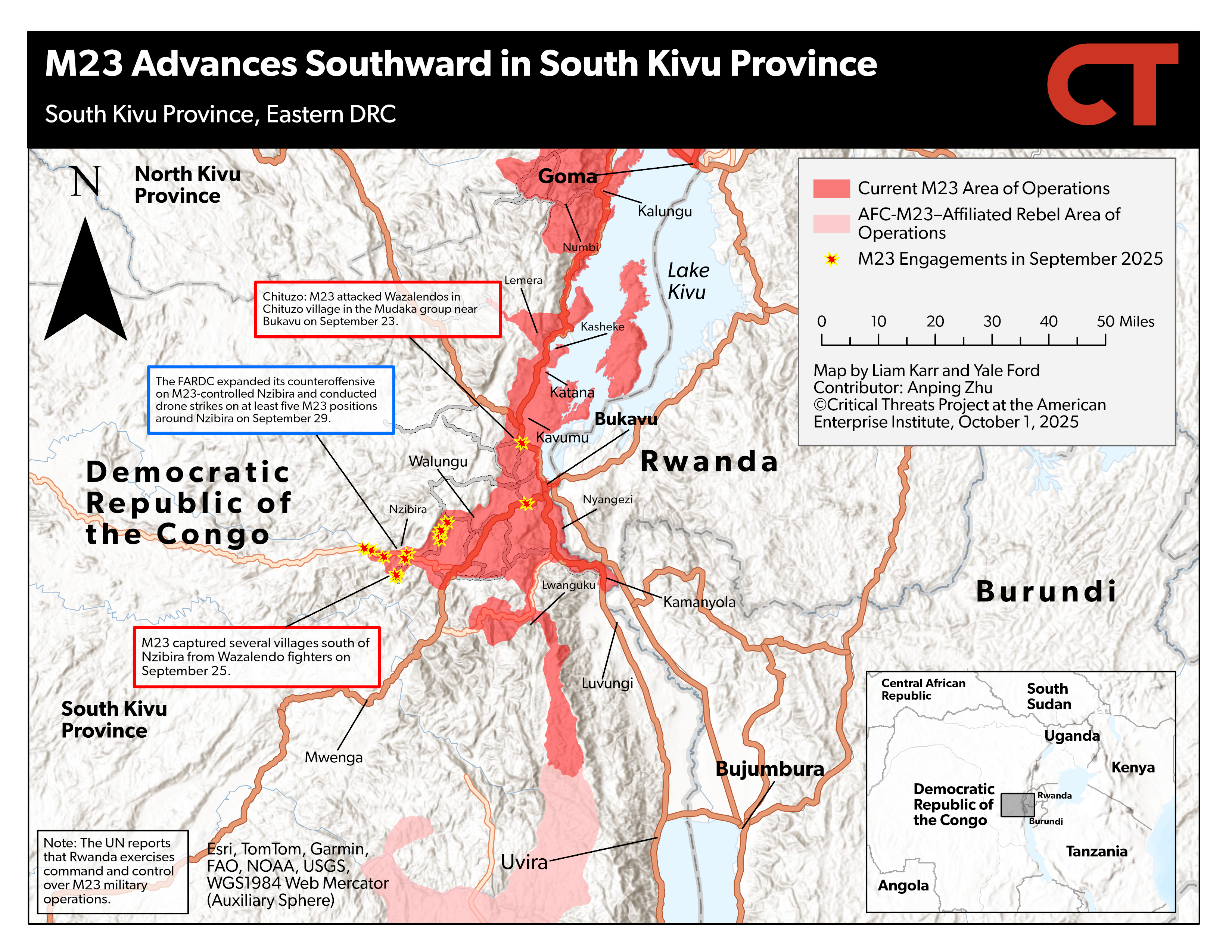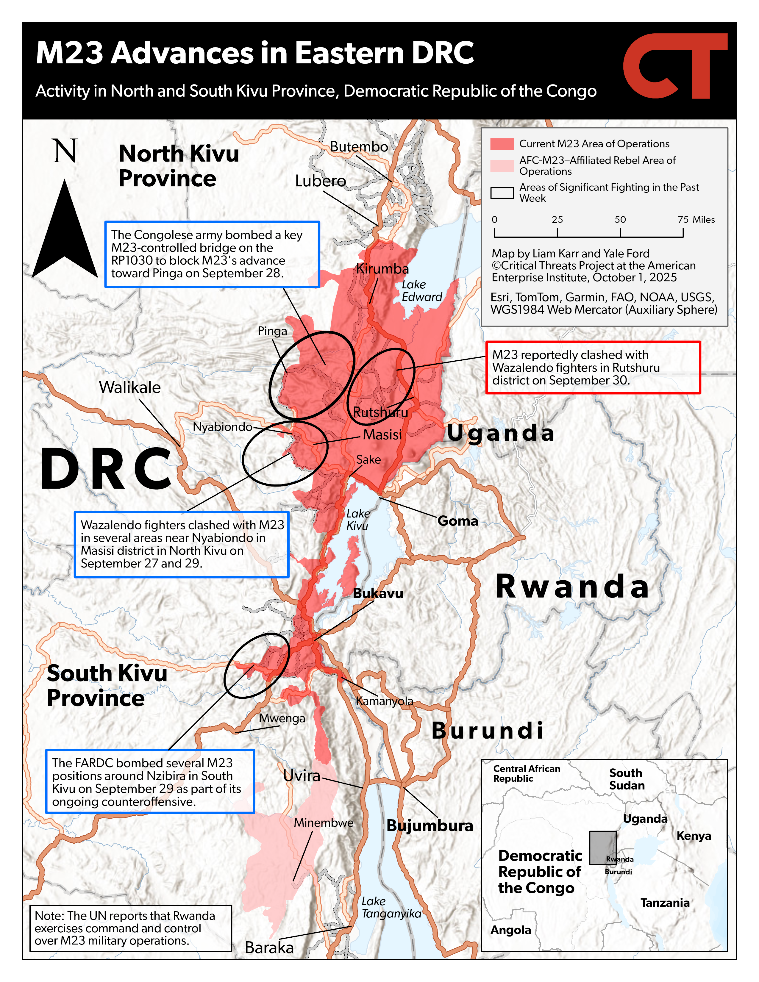 The Congolese army (FARDC) expanded its counteroffensive on M23-controlled Nzibira in South Kivu. The Congolese media outlet Radio Okapi reported that the FARDC conducted drone strikes on at least five M23 positions around Nzibira in southern Walungu district on September 29.[iv] The outlet reported that the FARDC and pro-Congolese government Wazalendo fighters established defensive positions in three locations around Nzibira about 12 miles from the frontlines.[v] The FARDC had conducted an initial round of drone strikes on M23 positions in Nzibira on September 27.[vi]