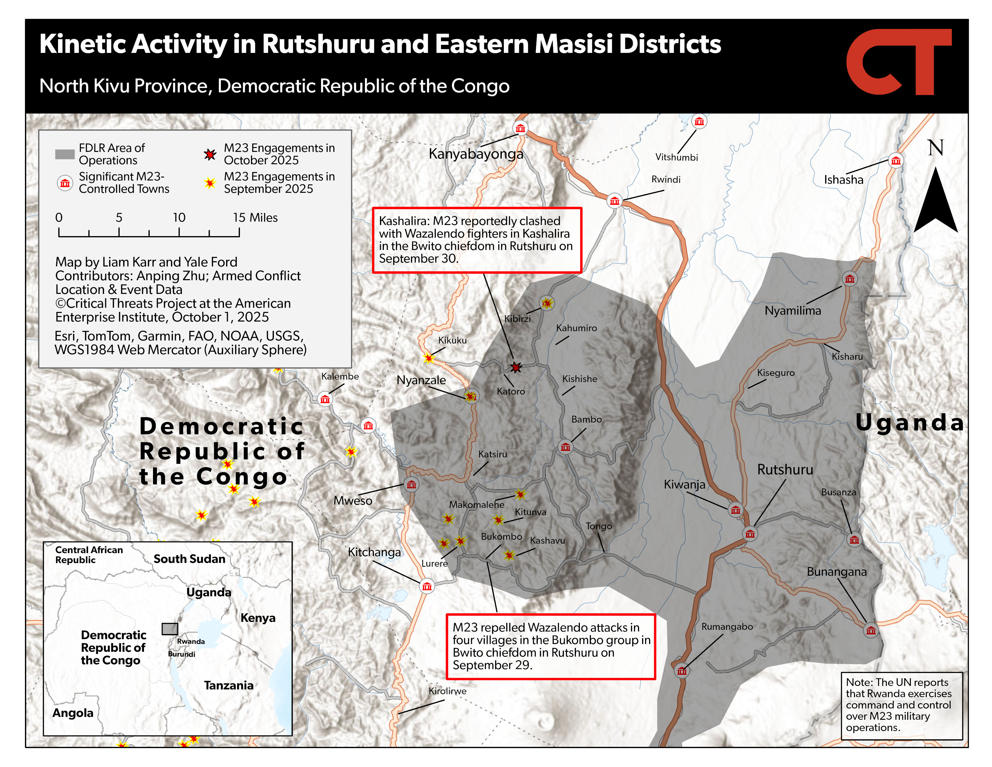 M23 clashed with pro-Congolese government Wazalendo fighters in Rutshuru district in North Kivu. Independent Congolese journalist Daniel Michombero reported that M23 clashed with Wazalendo fighters in Kashalira village in the Mutanda group in Bwito chiefdom in Rutshuru on September 30.[i] Kashalira is about eight miles south of Kibirzi on the edge of the Virunga National Park on a local road.