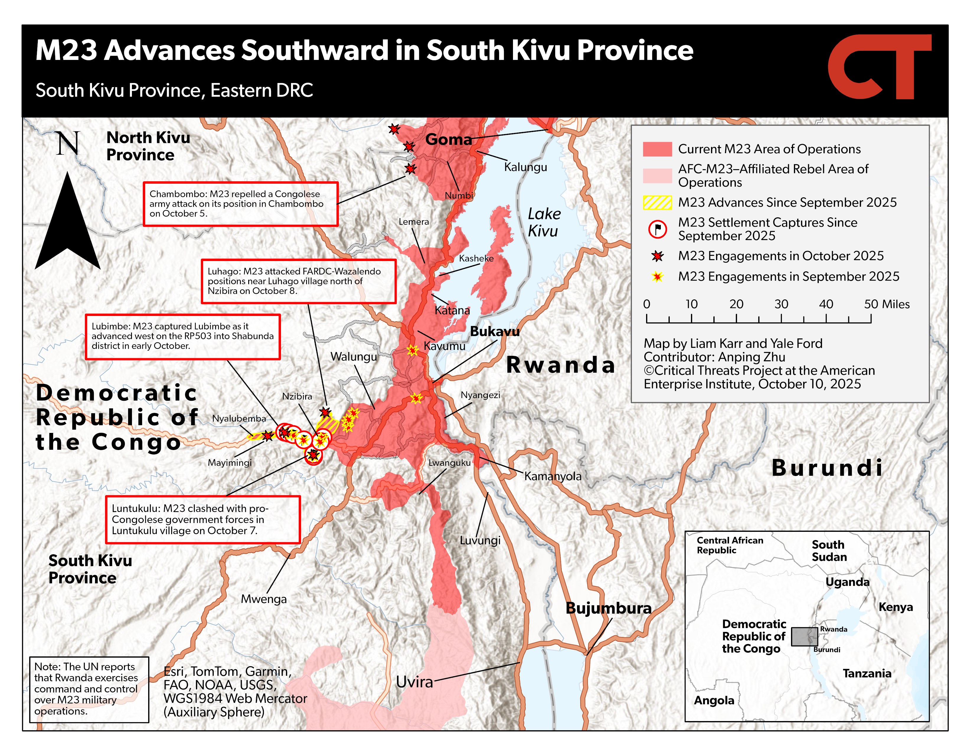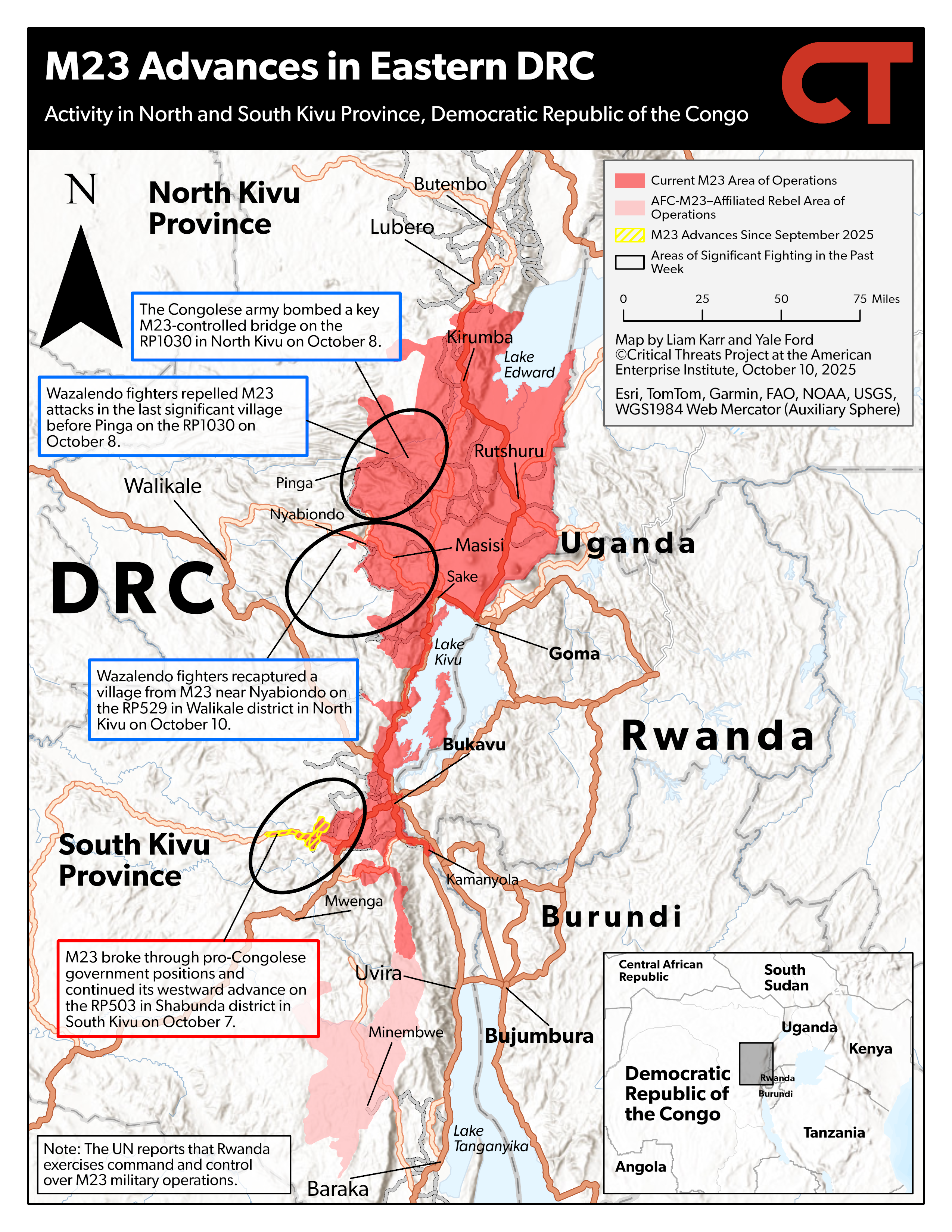 Wazalendo fighters recaptured a village from M23 near Nyabiondo on the RP529 in Walikale district. Wazalendo fighters reportedly attacked and dislodged M23 from four of its five positions in Kibati village on the RP529 on October 10.[vii] Kibati is about 13 miles west of Nyabiondo on the RP529. Actualite.cd reported that Wazalendo fighters launched the attacks in Kibati from about six miles west on the RP529 in Miba village.[viii] M23 has controlled Kibati since April 2025.