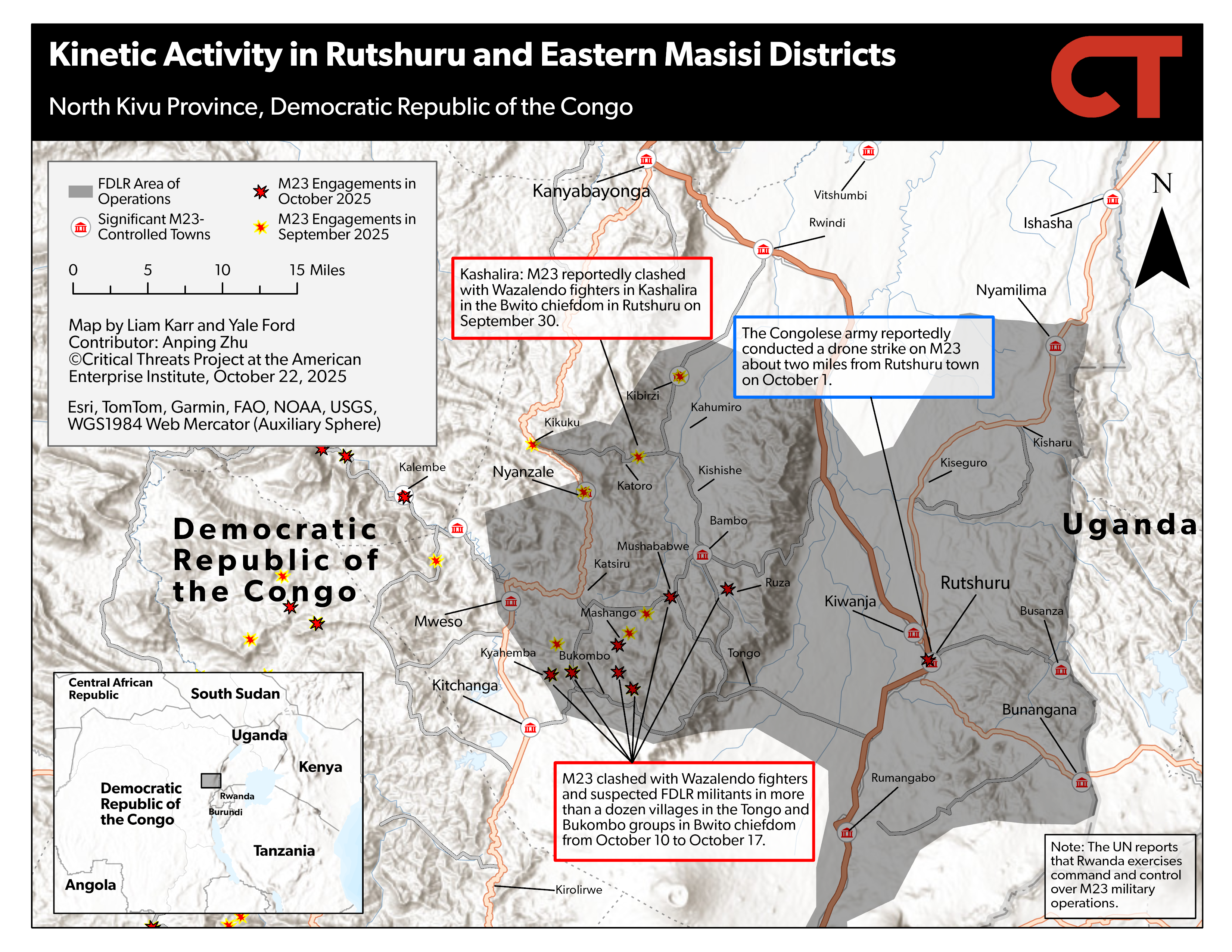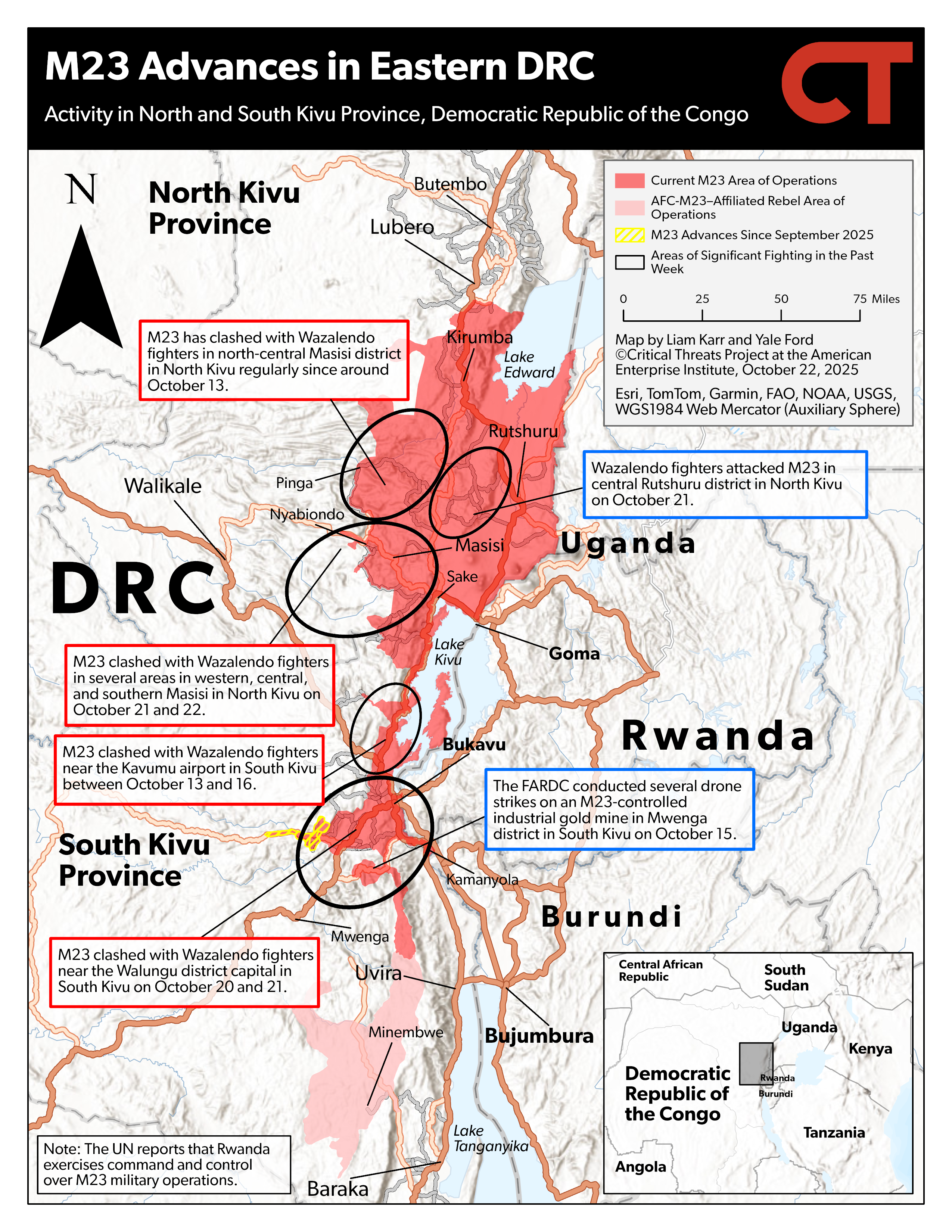 [ii] https://kivumorningpost dot com/2025/10/12/rutshuru-reprise-des-combats-entre-les-wazalendo-cmc-fdp-et-les-elements-de-lafc-m23-dans-le-groupement-de-tongo; https://www.radiookapi dot net/2025/10/13/actualite/securite/poursuite-de-violents-combats-entre-lafc-m23-et-les-wazalendo-rutshuru; https://kivumorningpost dot com/2025/10/14/rutshuru-affrontements-entre-afc-m23-et-fdlr-allies-aux-wazalendo-a-bukombo; https://x.com/TazamaRDC_Infos/status/1978415866703184054; https://kivumorningpost dot com/2025/10/15/rutshuru-troisieme-journee-des-combats-entre-lafc-m23-et-c-wazalendo-cmc-fdp-allies-aux-fdlr-dans-le-tongo; https://www.radiookapi dot net/2025/10/15/actualite/securite/situation-humanitaire-et-securitaire-toujours-volatile-dans-le-bwito; https://x.com/HeritierBarak/status/1978542030499258574; https://kivumorningpost dot com/2025/10/16/rutshuru-violents-combats-entre-les-wazalendo-fdlr-et-lafc-m23-a-nyiramariba; https://x.com/KivuMorningPost/status/1978854915087773877; https://www.radiookapi dot net/2025/10/17/actualite/securite/nouveaux-affrontements-entre-lafc-m23-et-le-cmc-bukombo; https://kivumorningpost dot com/2025/10/17/rutshuru-poursuite-des-combats-entre-lafc-m23-et-le-cmc-fdp-fdlr-a-bumbasha; https://x.com/KivuMorningPost/status/1979209335109751274; https://x.com/mediacongo/status/1979238481562894590; https://x.com/HeritierBarak/status/1979181144693248497; https://x.com/HeritierBarak/status/1979181153404793165