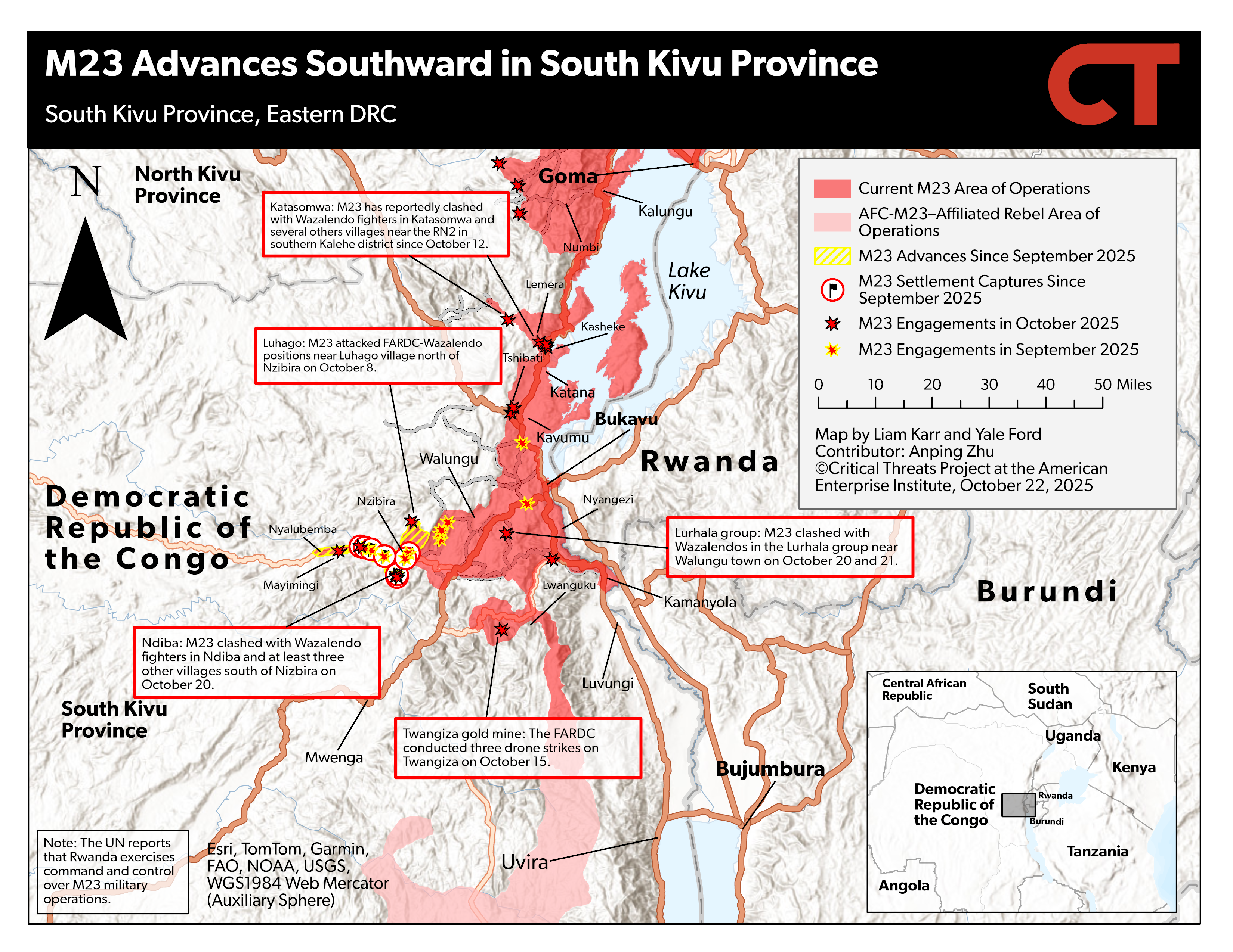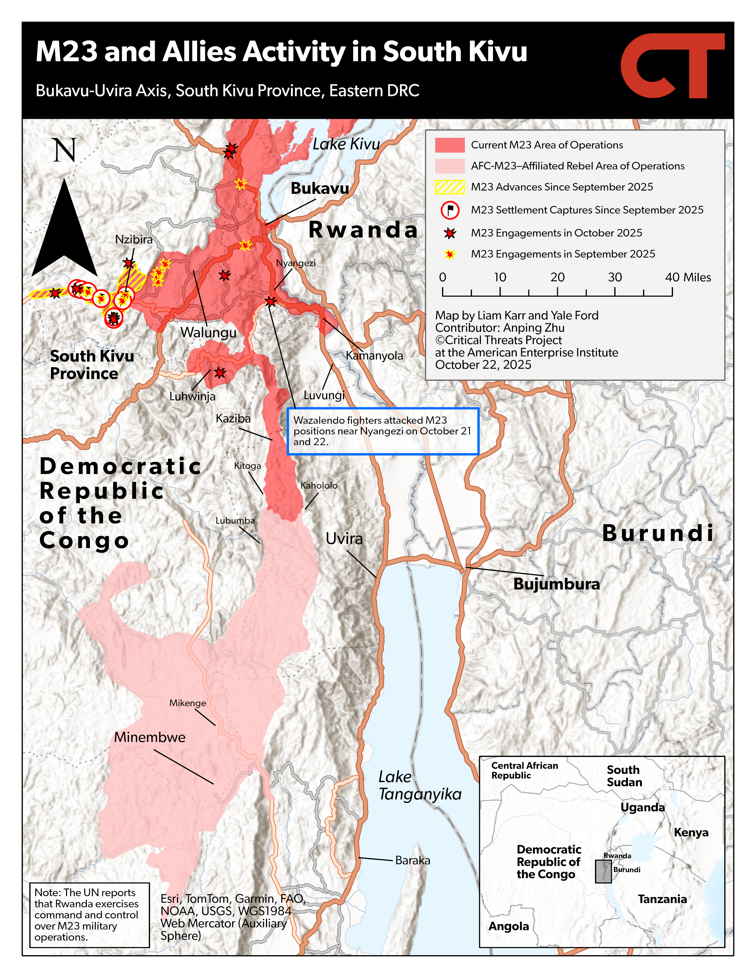 Wazalendo fighters attacked M23 positions south of Bukavu along the RN5 in South Kivu. Wazalendo fighters reportedly attacked M23 and clashed with the rebel group in at least 10 villages about 15 miles south of Bukavu and three miles south of Nyangezi village along the RN5 in Walungu district on October 21 and 22.[iii]