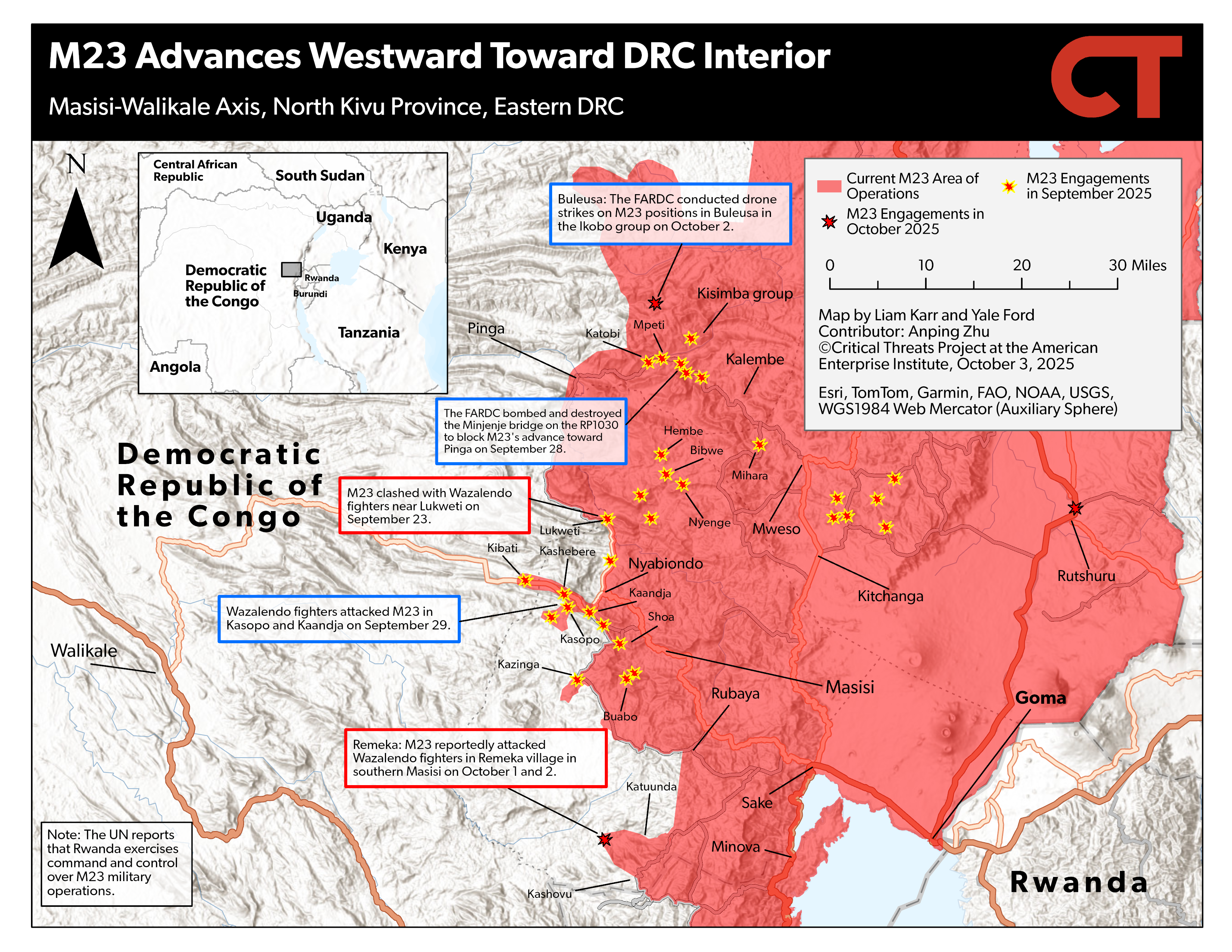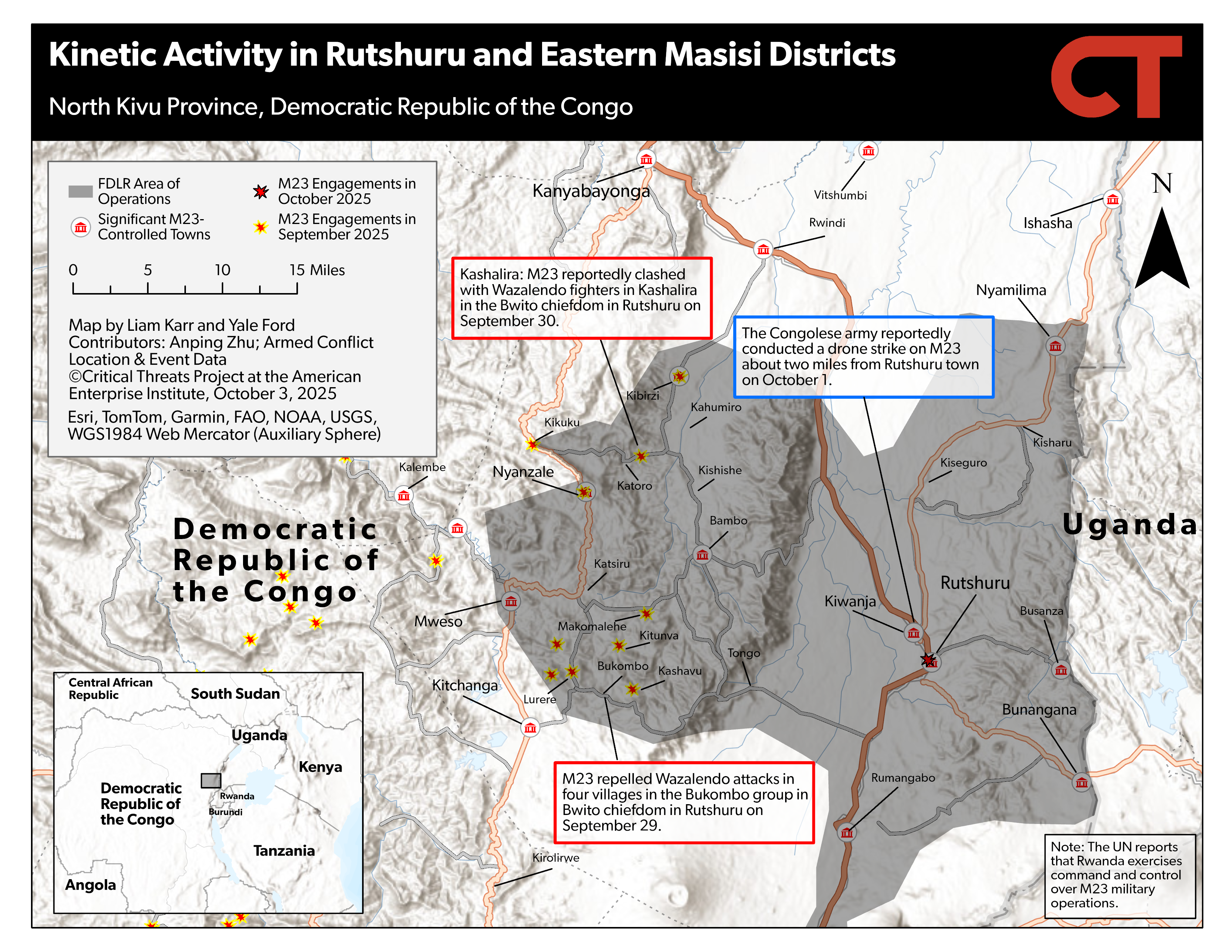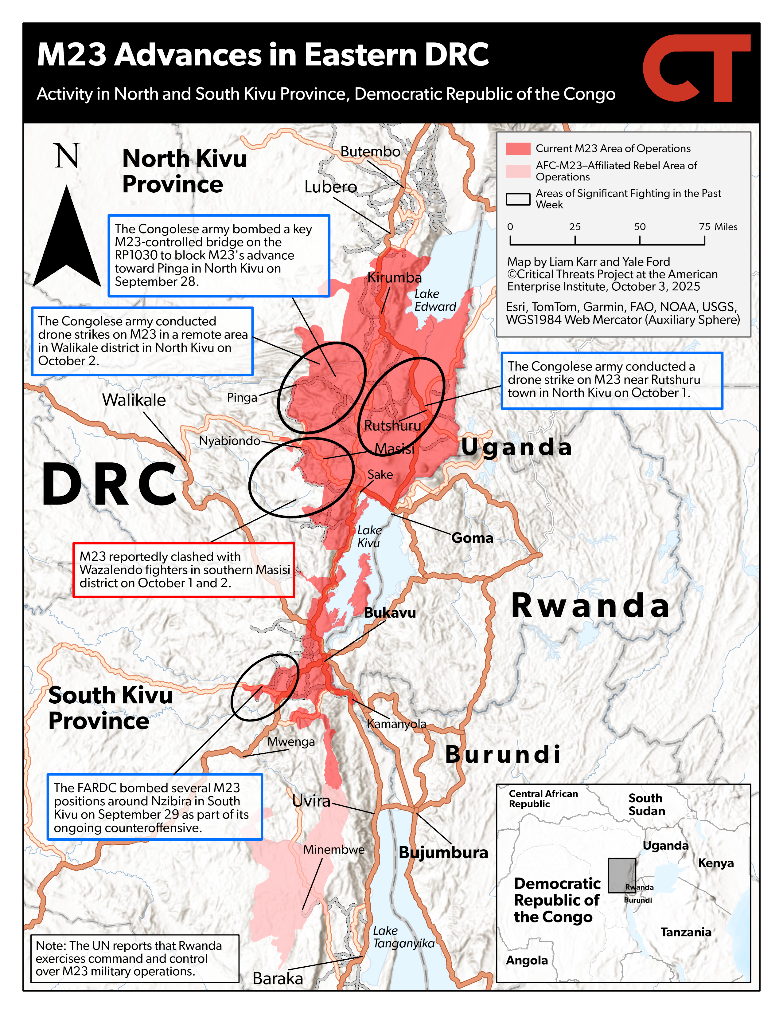 M23 reportedly clashed with pro-Congolese government Wazalendo fighters in southern Masisi district. The Congolese media outlet Beto.cd reported that M23 attacked several Wazalendo positions near Remeka village in the Katoyi sector in Masisi on October 1 and 2.[viii] Remeka is about 13 miles southwest of Rubaya in southern Masisi district.