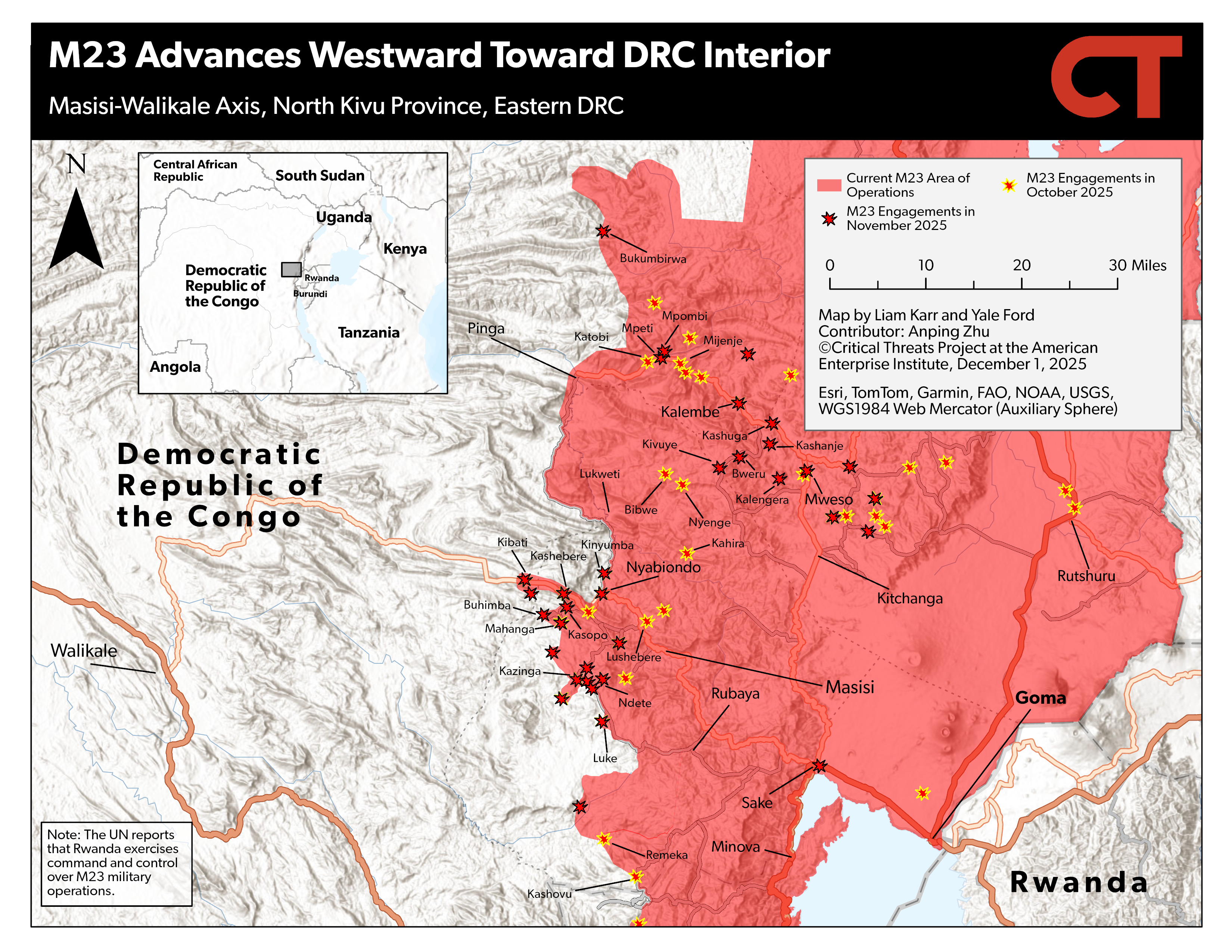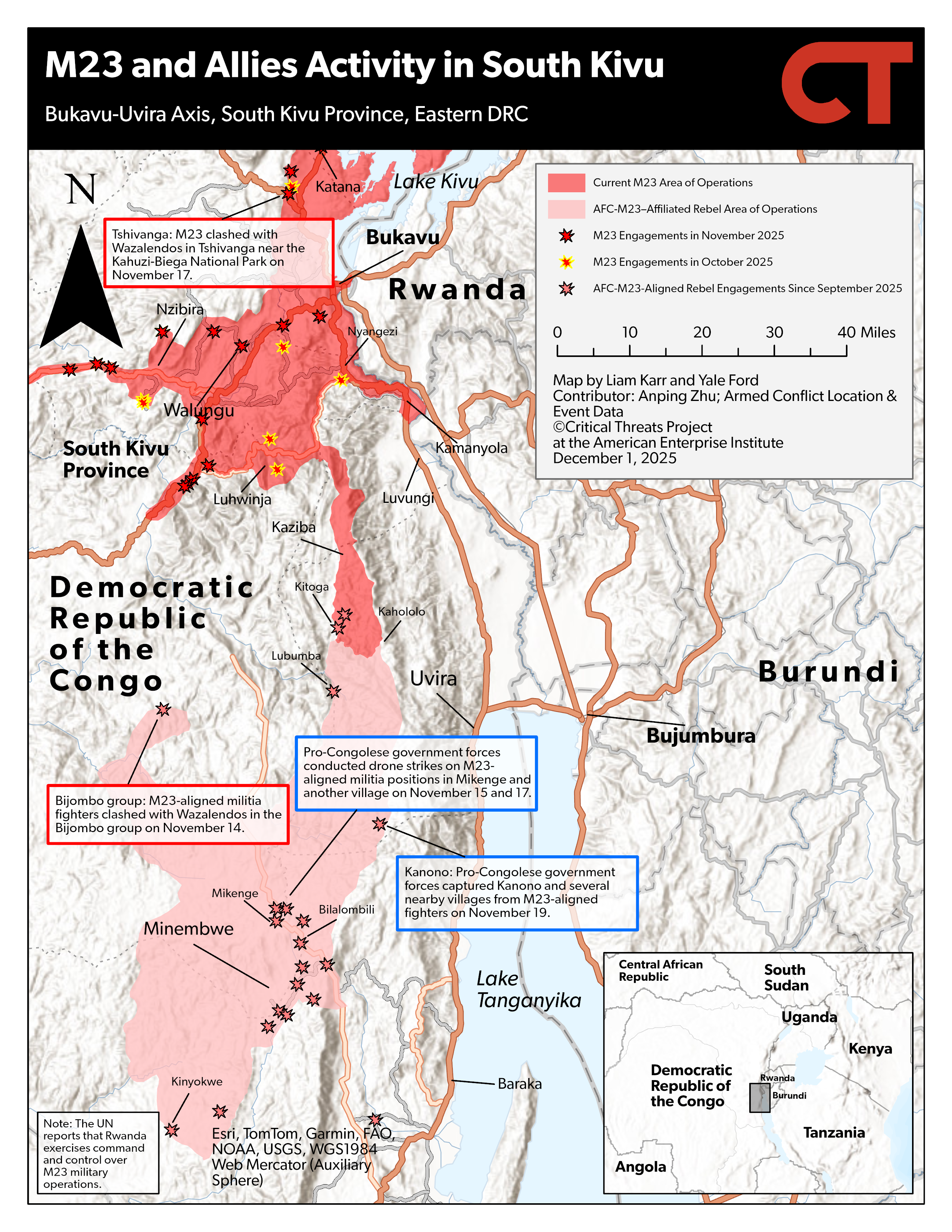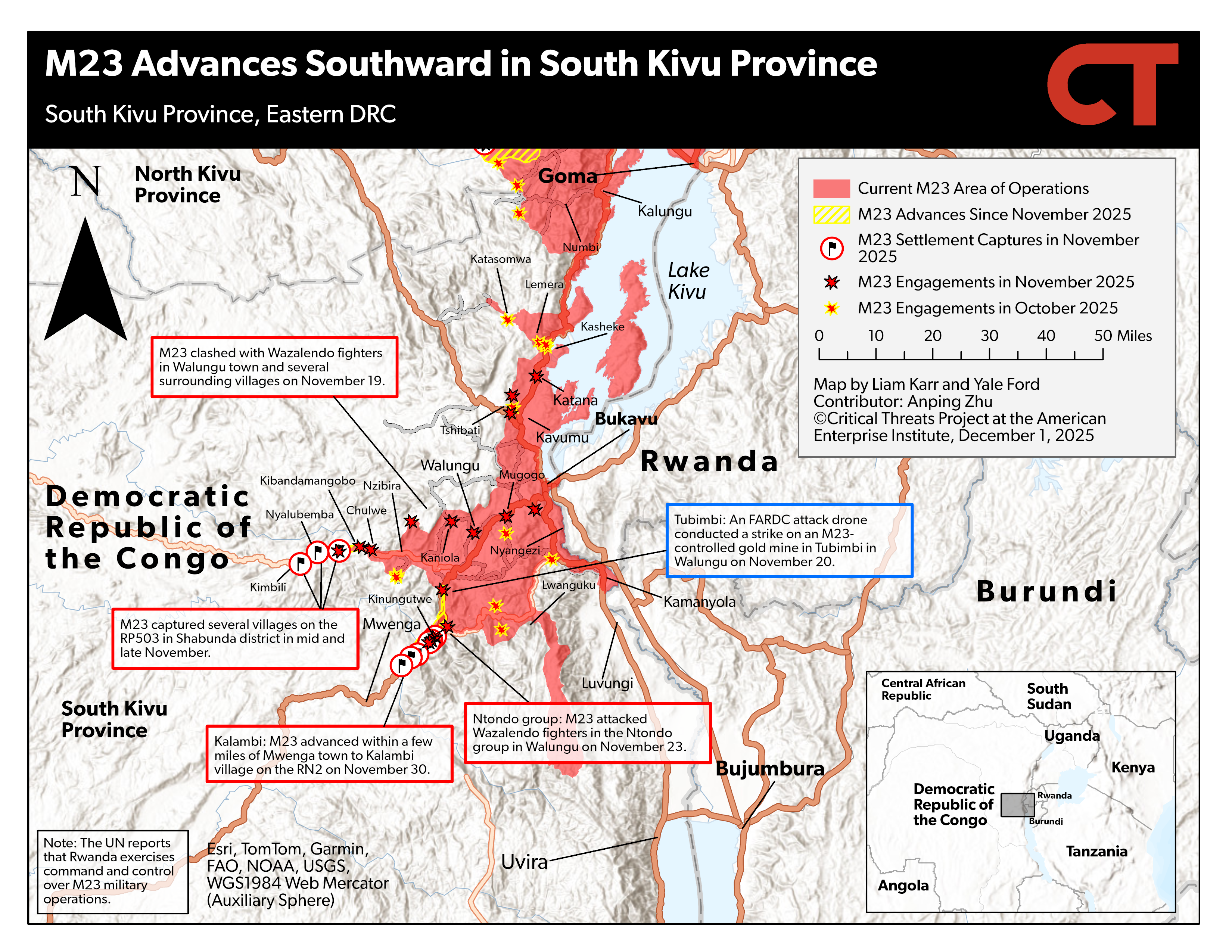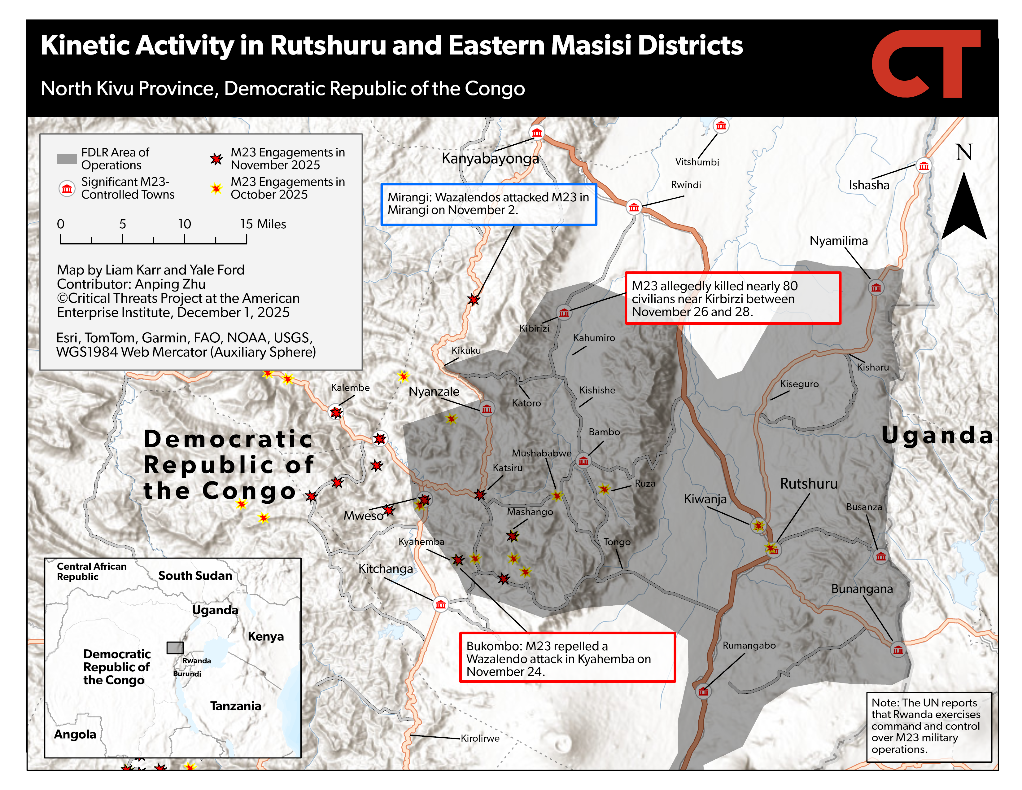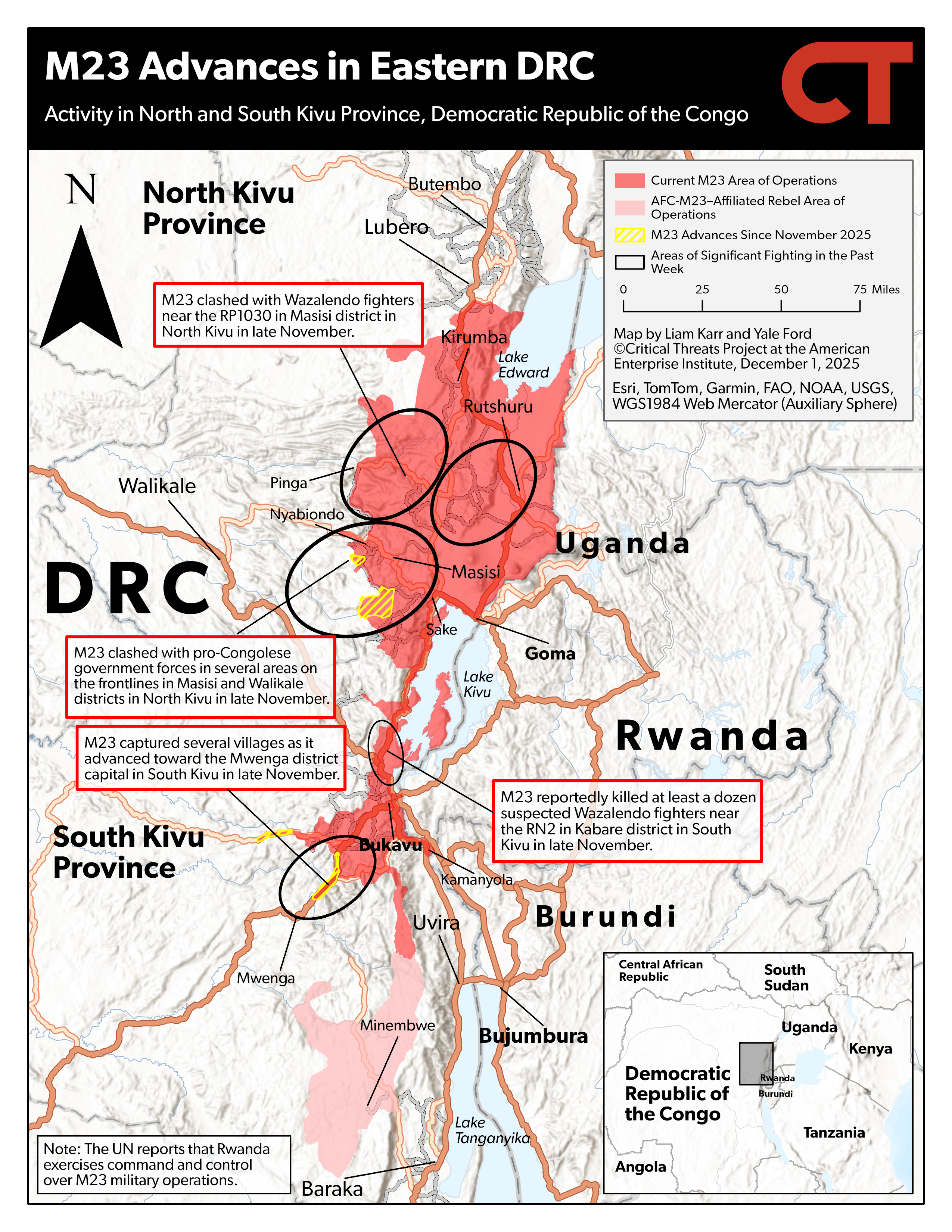 Key Takeaway: The United States will host the Congolese and Rwandan presidents to sign the US-backed peace framework on December 4. M23 advanced toward the Mwenga district capital in South Kivu. M23 clashed with Congolese army and pro-Congolese government Wazalendo fighters near the border between Masisi and Walikale districts in North Kivu. M23 clashed with pro-Congolese government forces in several areas along the RP529 in North Kivu.