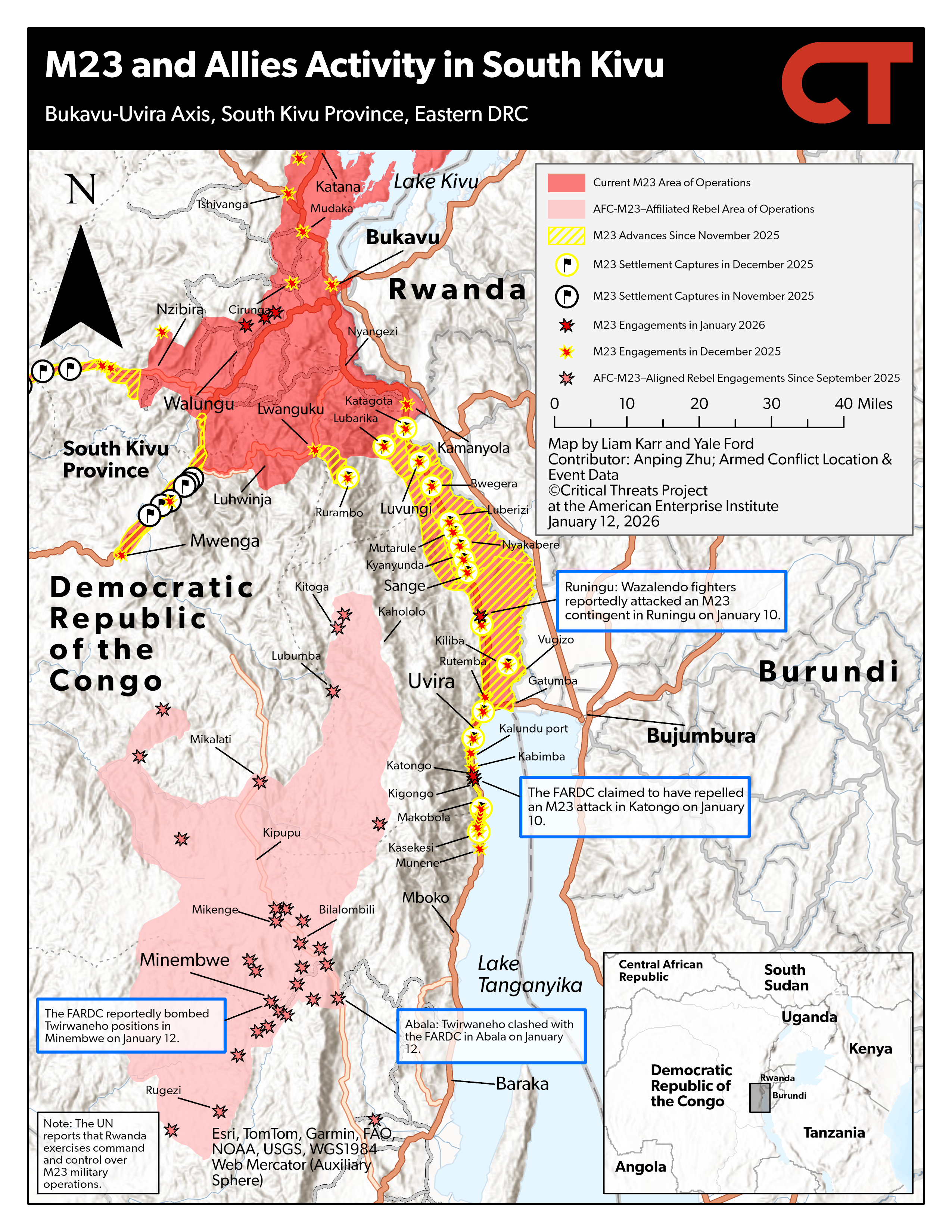 Pro-Congolese government forces reportedly bombed and clashed with M23-aligned fighters in the South Kivu highlands. M23 accused the FARDC of bombing M23-aligned Twirwaneho positions with attack drones in a locality near Minembwe town in Fizi district on January 12.[v] The Congolese media outlet Kivu Morning Post reported that Twirwaneho fighters clashed with pro-Congolese government forces in Abala village—roughly 26 miles east of Minembwe via the RP527 and a local road—in Fizi on January 12.[vi] Twirwaneho had accused the Burundian army (FDNB) on January 8 of deploying additional troops to Bibogobogo and Point Zéro villages east of Minembwe near Abala.[vii] The Burundian media outlet SOS Médias Burundi reported on January 9 that the FDNB deployed a new contingent of troops to this area in Fizi and to Kalemie, the Tanganyika provincial capital, from Burundi between December 29 and January 4 to relieve two isolated FDNB battalions in the highlands and support the FARDC and Wazalendo fighters against M23.[viii]