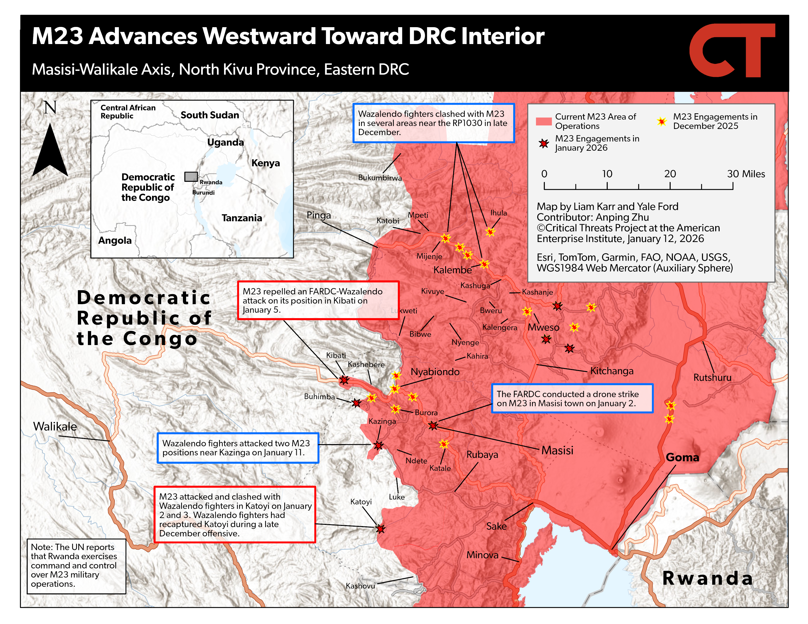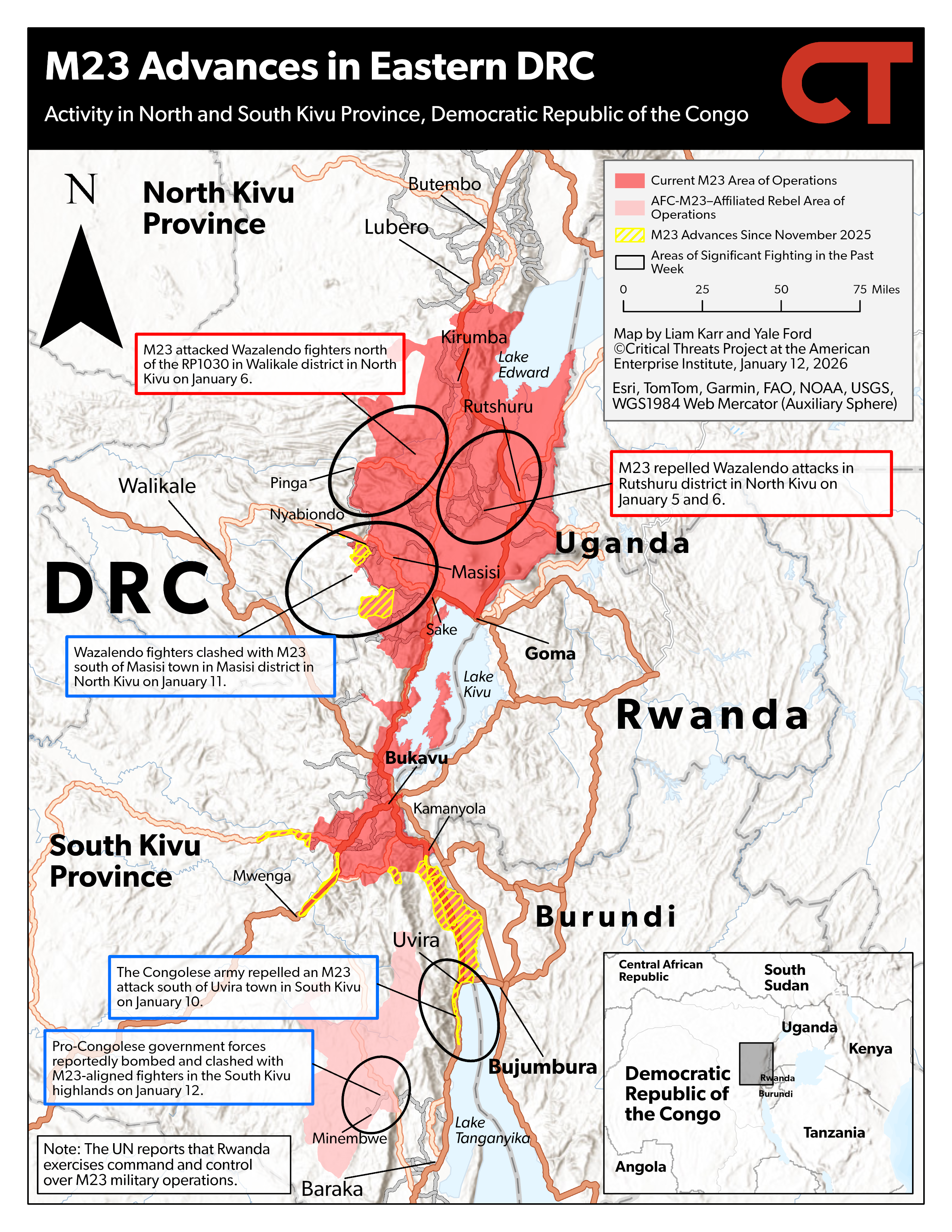 An in-depth review of activity related to the war in the eastern DRC between M23 and its Rwandan backers and pro-Congolese government forces every Monday, Wednesday, and Friday. Map shapefiles are available by request via email at [email protected].