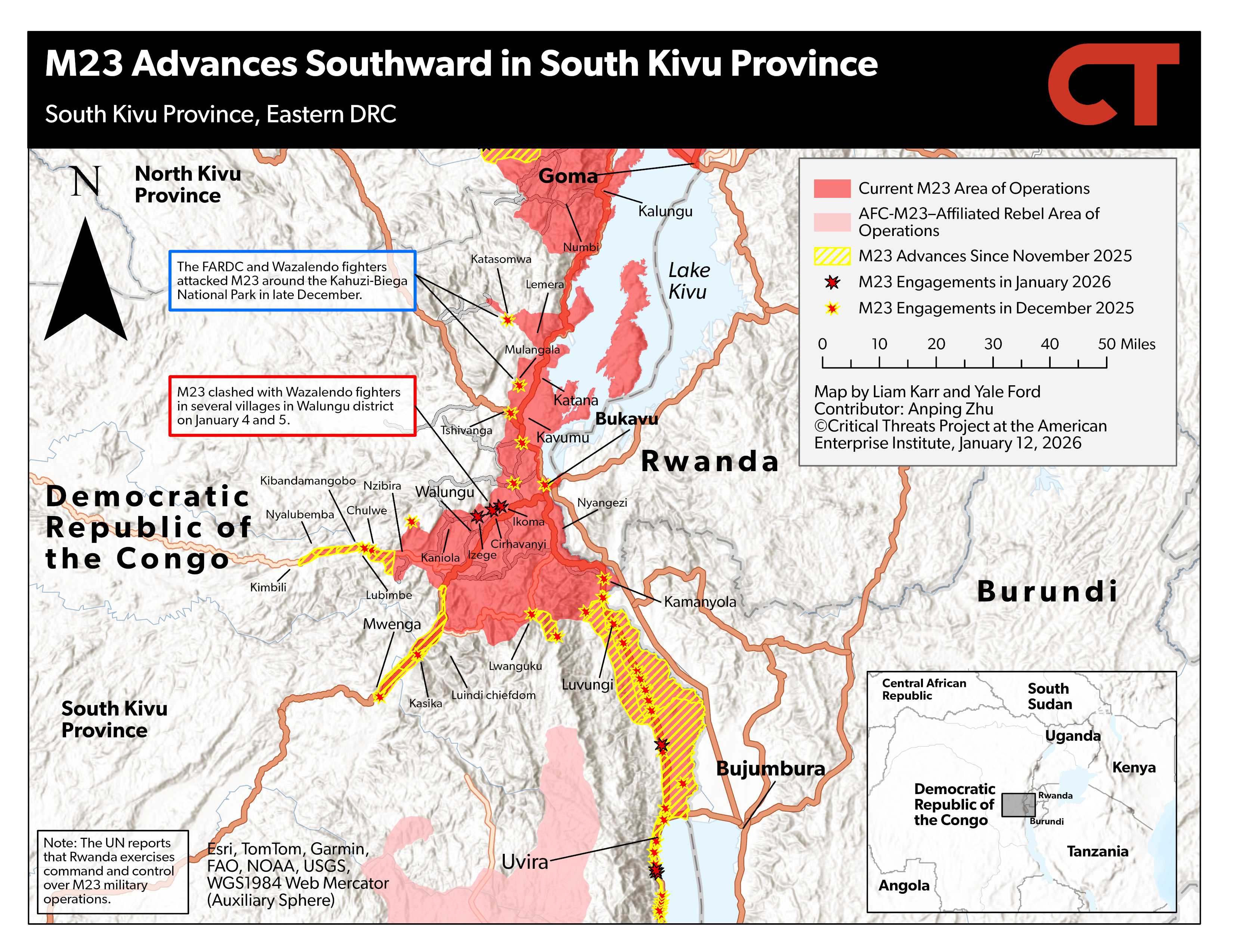 Wazalendo fighters reportedly attacked M23 north of Uvira town on the RN5. The independent Congolese journalist Daniel Michombero reported on social media on January 10 that Wazalendo fighters ambushed and killed several M23 fighters in Runingu village in the Ruzizi Plain.[iv] Runingu is about 17 miles north of Uvira town on the RN5.