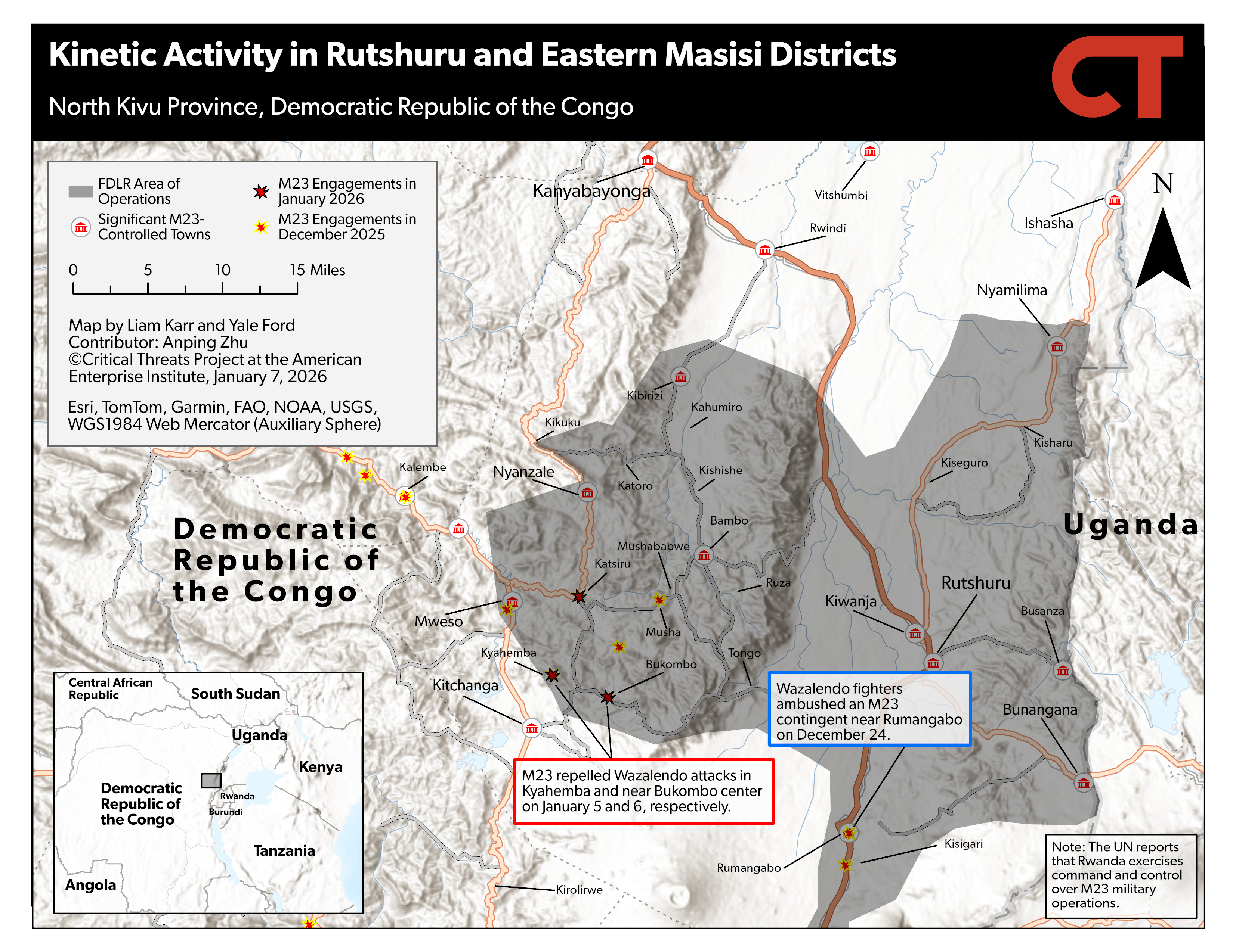 M23 repelled pro-Congolese government Wazalendo attacks in Rutshuru district in North Kivu. The Congolese media outlet Kivu Morning Post reported that M23 repelled a Wazalendo attack in Kyahemba village in the Bukombo group in Bwito chiefdom in Rutshuru on January 5.[i] Kyahemba is about nine miles northwest of Kitchanga town on the RP1030 in Masisi district. Kivu Morning Post reported separately that M23 repelled a Wazalendo attack near Bukombo center, which is about five miles east of Kyahemba on a local road, on January 6.[ii] Wazalendo fighters clash regularly with M23 in Bwito, especially in Bukombo, where M23 and the Rwandan army conduct counterinsurgency operations against Wazalendos and fighters from the Forces démocratiques de libération du Rwanda (FDLR).