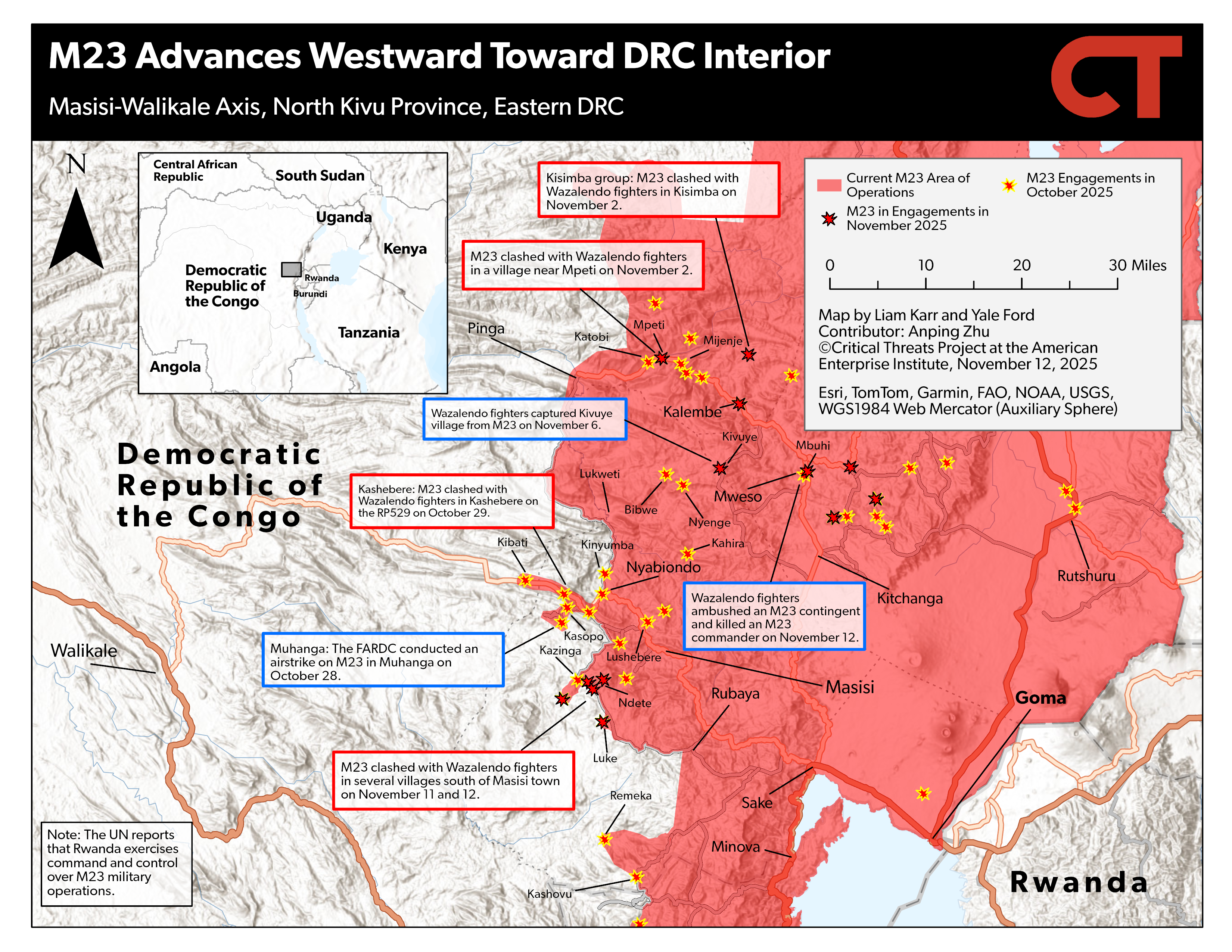 M23 clashed with Wazalendo fighters in several areas in Masisi district in North Kivu. M23 reportedly clashed with Wazalendo fighters in Mweso on the RP1030 in Masisi on November 12.[iii] Wazalendo fighters ambushed an M23 contingent near Mweso and killed an M23 commander.[iv] The Congolese media outlet Radio Okapi reported that M23 also clashed with Wazalendo fighters in five villages in the Nyamaboko group around Kazinga—about 15 miles southwest of Masisi—including in Ndete, on November 12.[v]